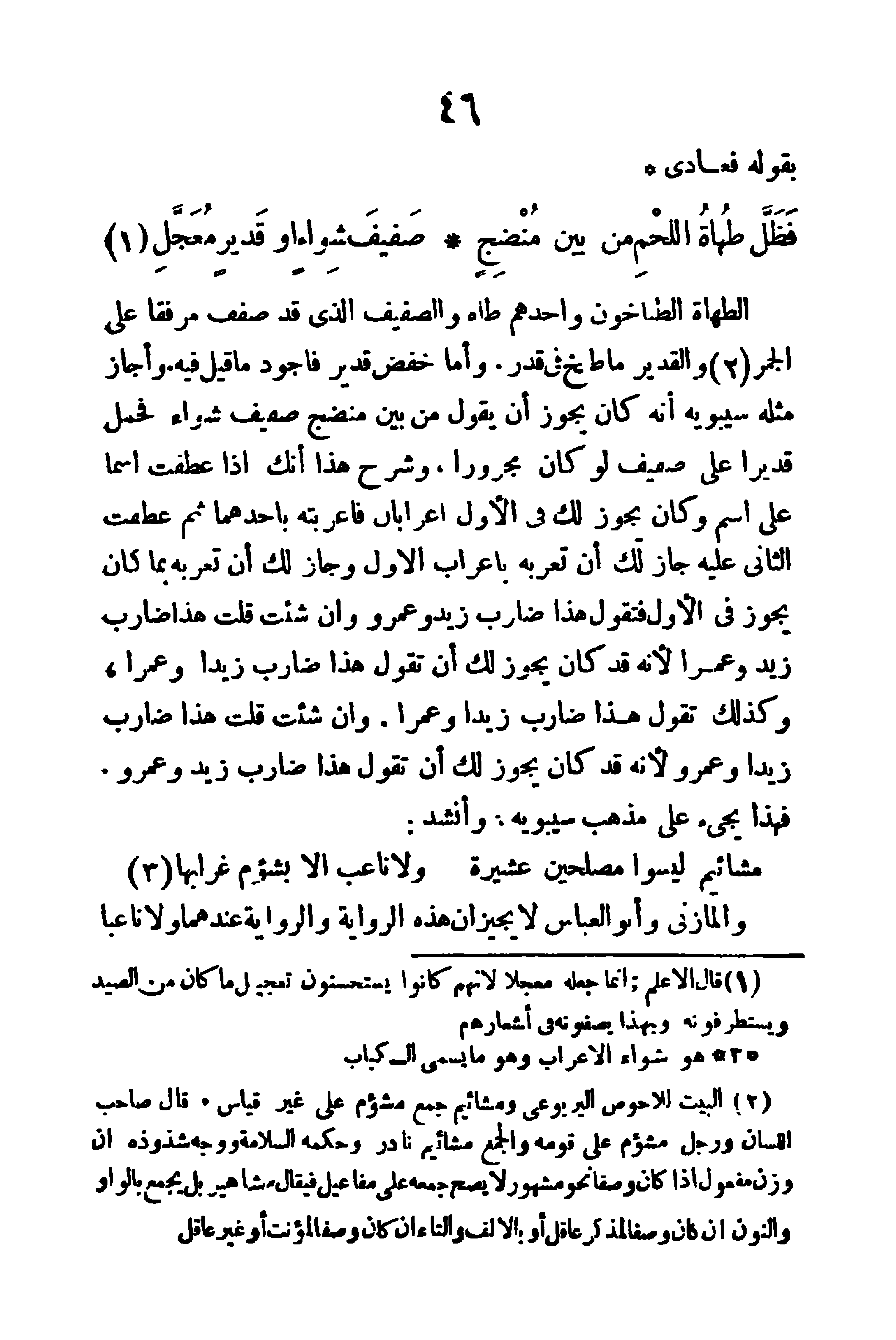 الطهاة: الطباخون، واحدهم طاه، والصفيف: الذي قد صُفف مرققا على الجمر، والقدير: ما طبخ في قدر، وأما خفض (قدير) فأجود ما قيل فيه - وأجاز مثله سيبويه - إنه كان يجوز أن يقول (من بين منضج صفيف شواء) فحمل قديرا على صفيف لو كان مجرورا، وشرح هذا أنك إذا عطفت اسما على اسم، وكان يجوز لك في الأول إعرابان فأعربته بأحدهما ثم عطفت الثاني عليه جاز لك أن تعربه بإعراب الأول وجاز لك أن تعربه بما كان يجوز في الأول فتقول (هذا ضاربُ زيدٍ وعمرٍو) وإن شئت قلت: (هذا ضاربُ زيدٍ وعمراً) لأنه قد كان يجوز لك أن تقول: (هذا ضاربٌ زيداً وعمراً) وان شئت قلت: (هذا ضاربٌ زيداً وعمرٍو)؛ لأنه قد كان يجوز لك أن تقول: (هذا ضاربُ زيدٍ وعمرٍو) فهذا يجيء على مذهب سيبويه، وأنشد: