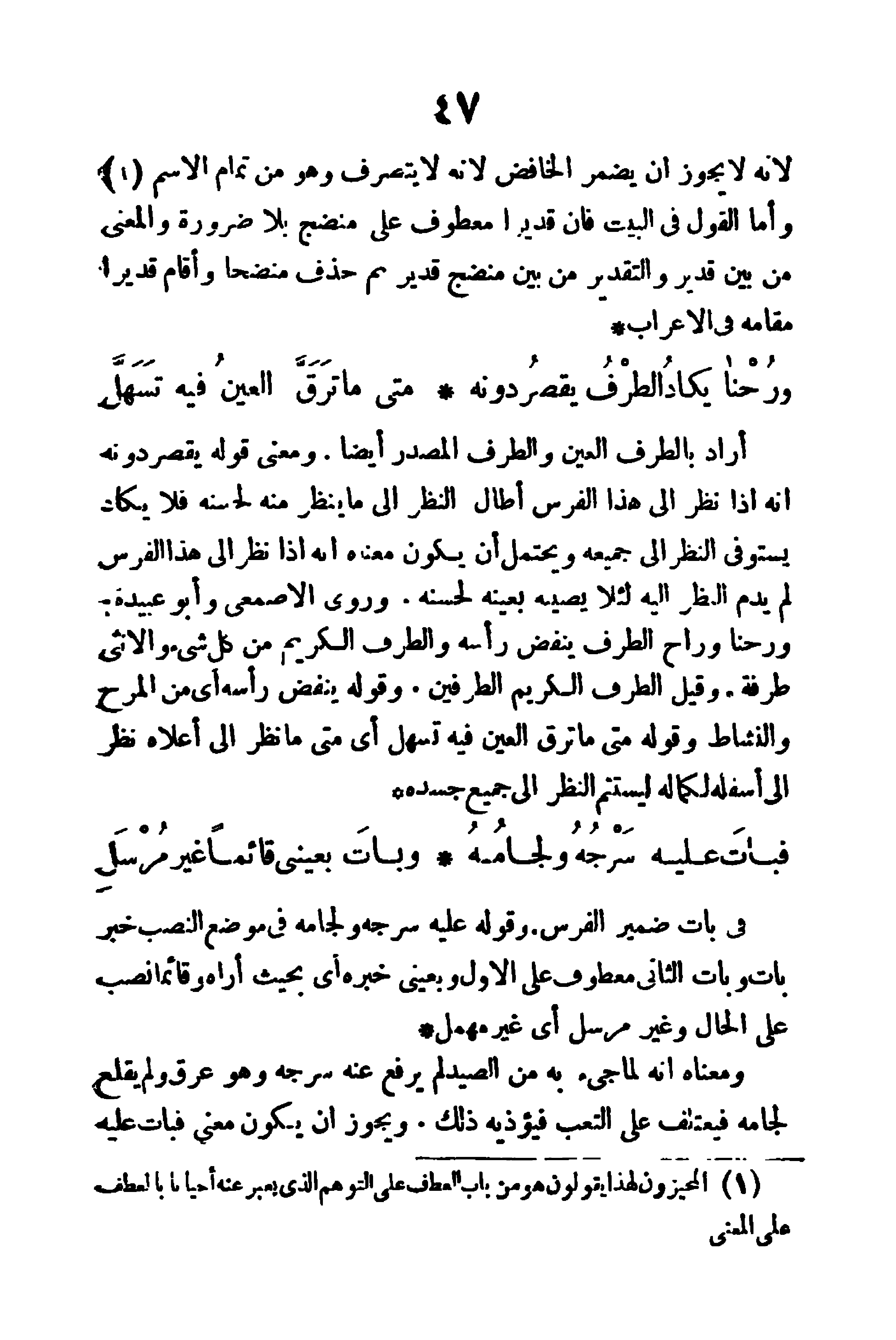 (فَبَاتَ عَلَيْهِ سَرْجُهُ وَلَجِامُهُ ... وَبَاتَ بِعَيْنِي قَائماً غَيْرَ مُرْسَلِ)