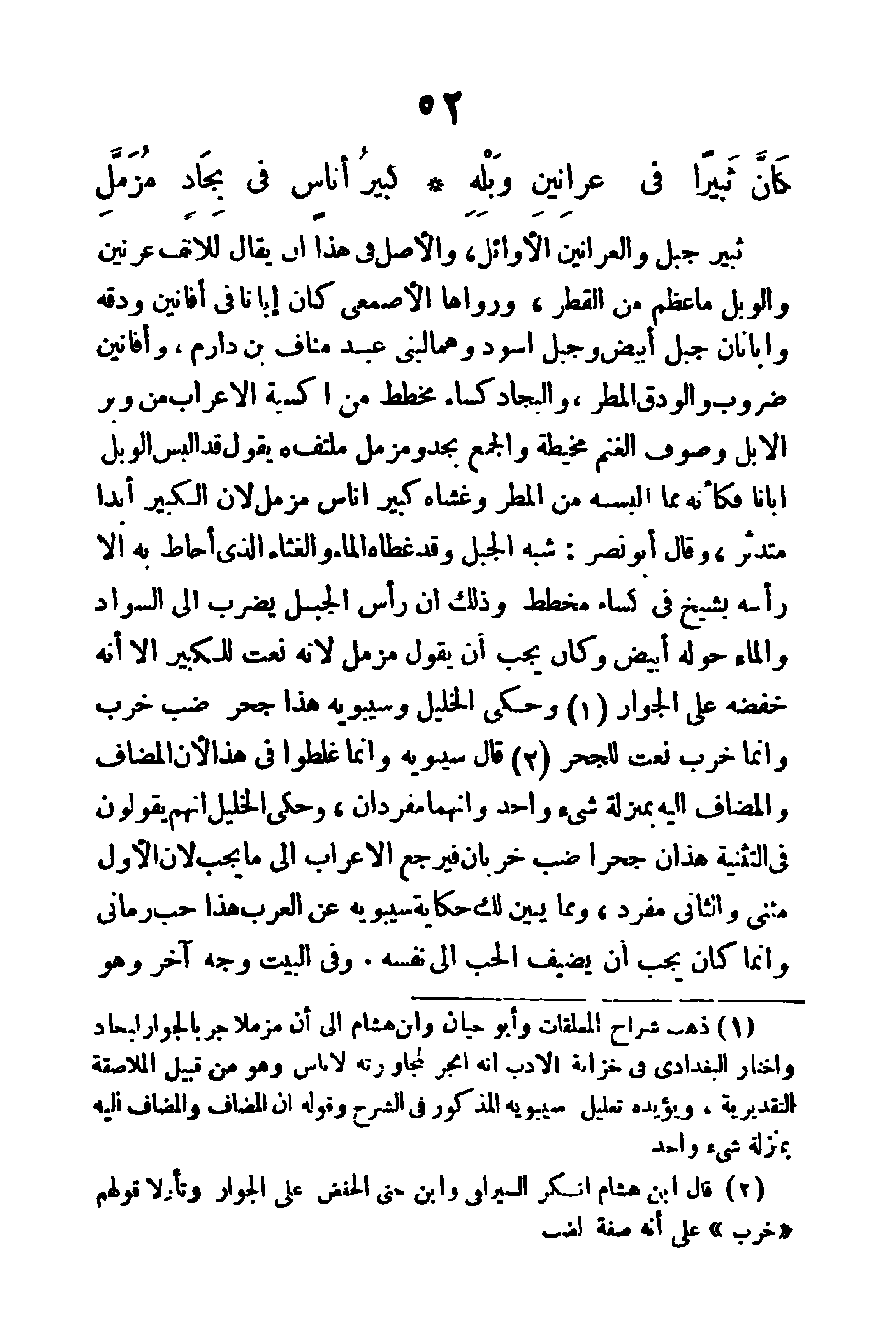 ثبير: جبل: والعرانين: الأوائل، والأصل في هذا أن يقال للأنف عرنين. والوبل: ما عظم من القطر، ورواها الأصمعي (كان أبانا في أفانين ودقه) وأبانان: جبل أبيض وجبل أسود، وهما لبني عبد مناف بن دارم، وأفانين: ضروب، والوةدق: المطر، والبجاد: كساء مخطط من أكسية الأعراب من وبر الإبل وصوف الغنم مخيطة، والجمع بُجد، ومزمل: ملتف. يقول: قد ألبس الوبل أبانا فكأنه مما ألبسه من المطر وغشاه كبير أناس مزمل لأن الكبير أبدا متدثر، وقال أبو نصر: شبه الجبل وقد غطاه الماء، والغثاء الذي أحاط به إلا رأسه، بشيخ في كساء مخطط، وذلك أن رأس الجبل يضرب إلى السواد، والماء حوله أبيض، وكان يجب أن يقول (مزمل) لأنه نعت للكبير، إلا إنه خفضه على الجوار، وحكى الخليل وسيبويه (هذا جحر ضب خرب) وإنما خرب نعت للجحر، قال سيبويه: وإنما غلطوا في هذا لأن المضاف والمضاف إليه بمنزلة شيء واحد، وأنهما مفردان،
