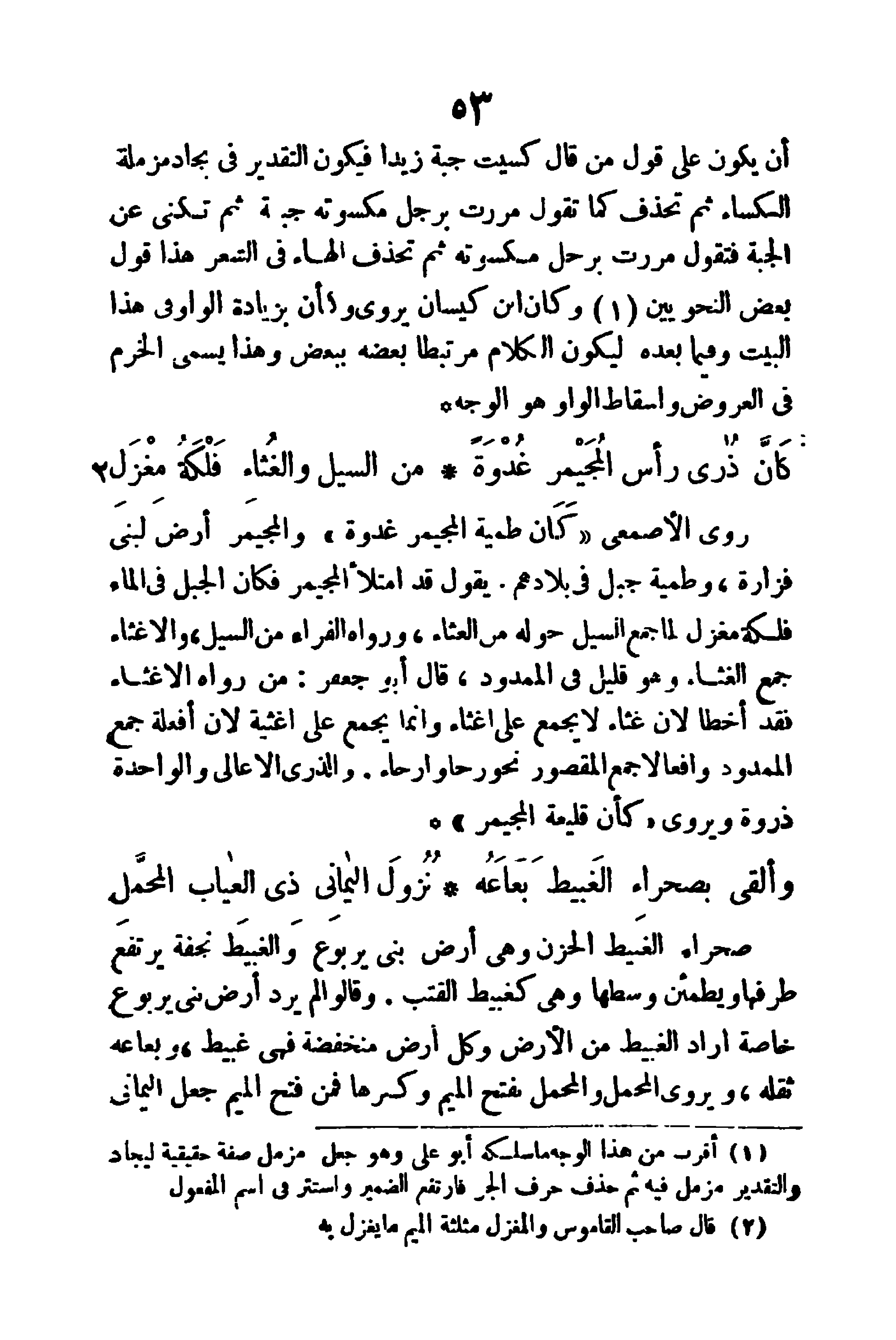 (كَأَنَّ ذُرَى رَأْسِ المُجَيْمِرِ غُدْوَةً ... مِنَ السَّيْلِ والغُثَاءِ َفِلْكَةُ مِغْزَلِ)