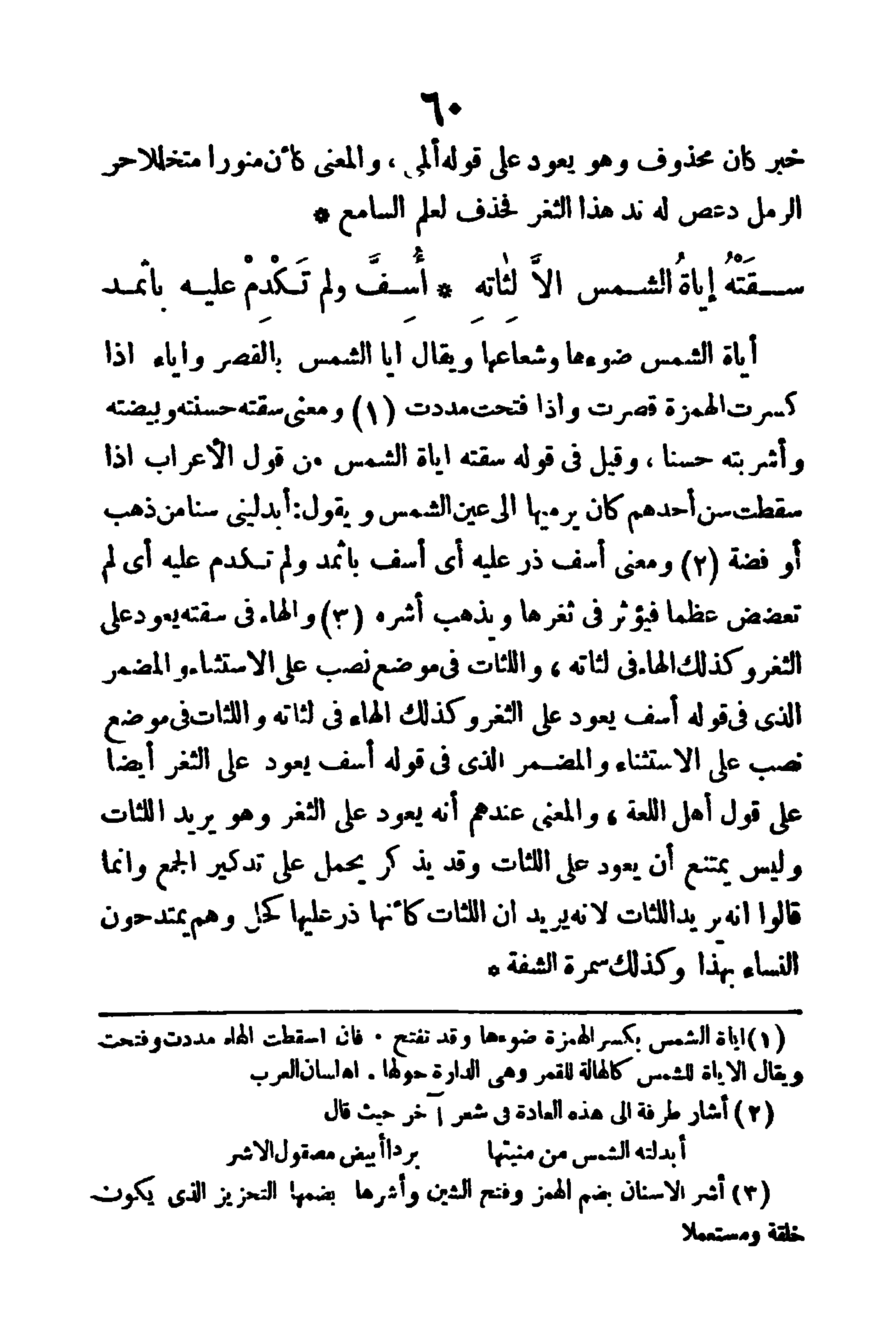 إياة الشمس: ضوءها وشعاعها، ويقال: (إيا الشَّمْس) بالقصر، وأياء: إذا كسرت الهمزة قصرت، وإذا فتحت مددت ومعنى سقته: حسَّنته وبيضته وأشربته حسنا، وقيل في قوله: (سقته إياة الشمس) من قول الأعراب إذا سقطت سن أحدهم كان يرميها إلى عين الشمس، ويقول: أبدليني سنا من ذهب أو فضة، ومعنى (أسفَّ) ذُر عليه، أي أسف بإثمد (ولم تكدم عليه) أي لم تعضض عظما فيؤثر في ثغرها ويذهب أشره، والهاء في سقته تعود على الثغر، وكذلك الهاء في (لثاته)، واللثات: في موضع نصب على الاستثناء، والمضمر الذي في قوله (أسف) يعود على الثغر أيضا على قول أهل اللغة، والمعنى عندهم إنه يعود على الثغر وهو يريد اللثات، وليس يمتنع أن يعود على اللثات، وقد يُذكر يحمل على تذكير الجمع، وإنما قالوا إنه يريد اللثات لأنه يريد أن اللثات كأنها ذر عليها كحل، وهم يمتدحون النساء بهذا، وكذلك سمرة الشفة.