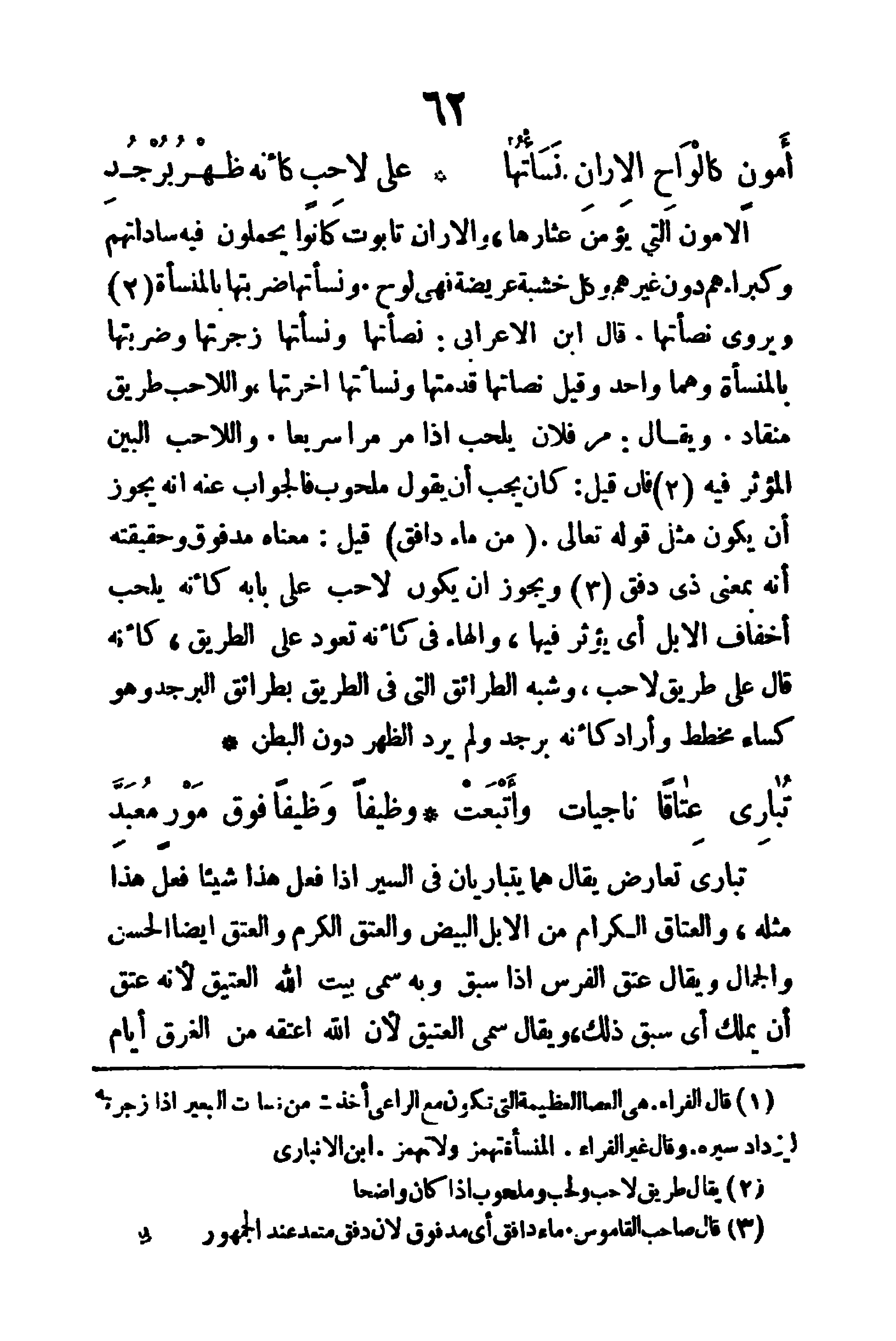تبارى: تعارض، يقال: هما يتباريان في السير، إذا فعل هذا شيئا فعل هذا مثله، والعتاق: الكرام من الإبل البيض، والعتق: الكرم، والعتق أيضا: الحُسن والجمال، ويقال: عتق الفرس؛ إذا سبق، وبه سمي بيت الله العتيق؛ لأنه عتق أن يملك أي سبق ذلك، ويقال: سمي العتيق لأن الله أعتقه من الغرق أيام