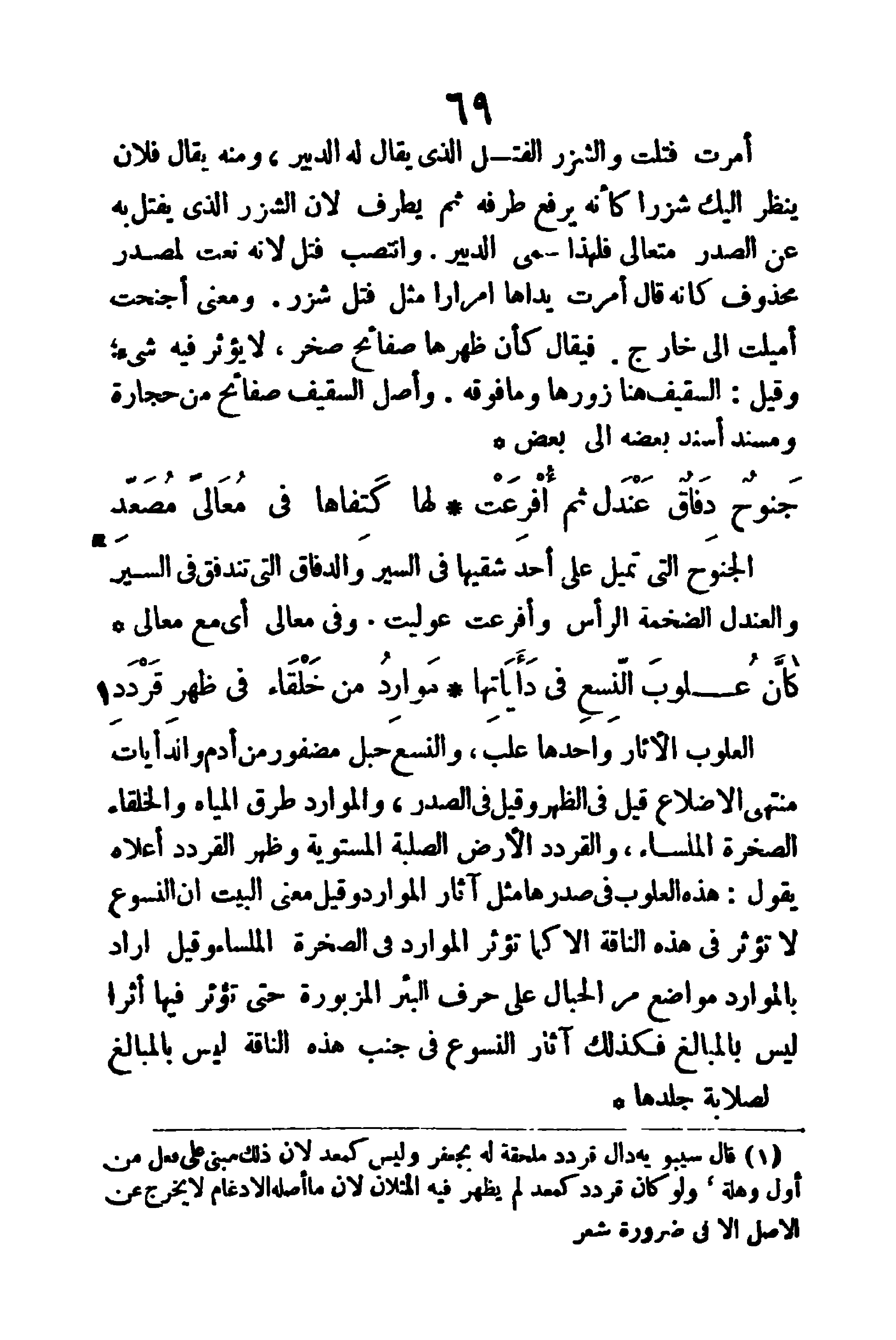 أُمرت: فتلت، والشزر: الفتل الذي يقال له الدبير، ومنه يقال (فلان ينظر إليك شزرا) كأنه يرفع طرفه ثم يطرف؛ لأن الشزر الذي يفتل به عن الصدر متعالي فلهذا سمي الدبير، وانتصب (فتل) لأنه نعت لمصدر محذوف، كأنه قال: أُمرت يداها إمرارا نثل فتل شزر، ومعنى (أجنحت) أميلت إلى خارج، فيقول: كأن ظهرها صفائح صخر، لا يؤثر فيه شيء، وقيل: السقيف هنا زورها وما فوقه، وأصل السقيف: صفائح من حجارة، ومسند: أسند بعضه إلى بعض.