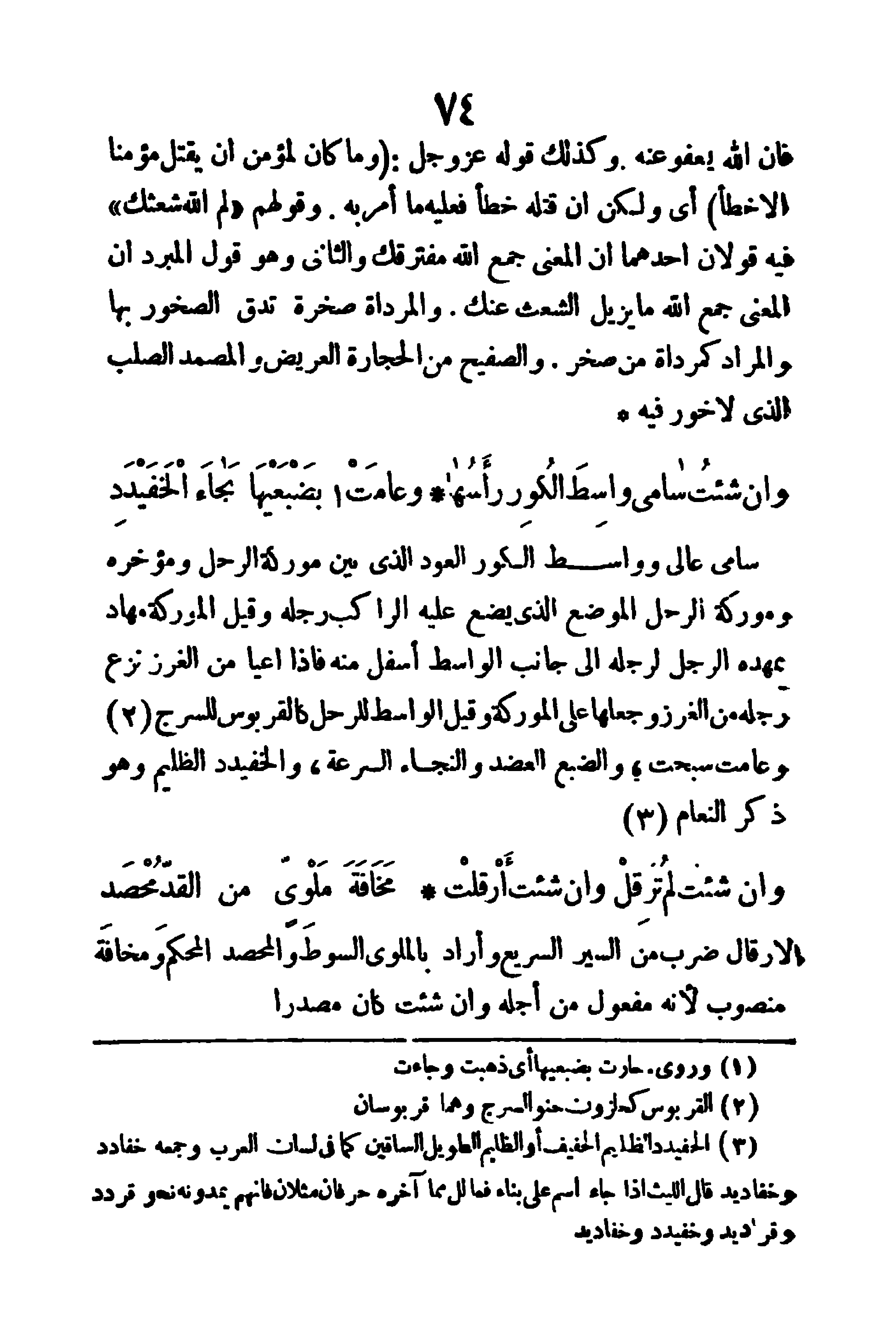 فإن الله يعفو عنه. وكذلك قوله عز وجل: (وَمَا كَانَ لِمُؤْمِن أن يَقْتُلَ مُؤْمِناً إِلاَّ خَطَأَ) أي ولكن أن قتله خطأ فعليه ما أمر به، وقولهم: (لمَّ الله شَعَثَك) فيه قولان: أحدهما أن المعنى جمع الله مفترقك، والثاني - وهو قول المبرد - أن المعنى جمع الله ما يزيل الشعث عنك. والمرداة: صخرة تدق الصخرة بها والمراد كمرداة من صخر. والصفيح من الحجارة: العريض، والمصمد: الصلب الذي لا خور فيه.