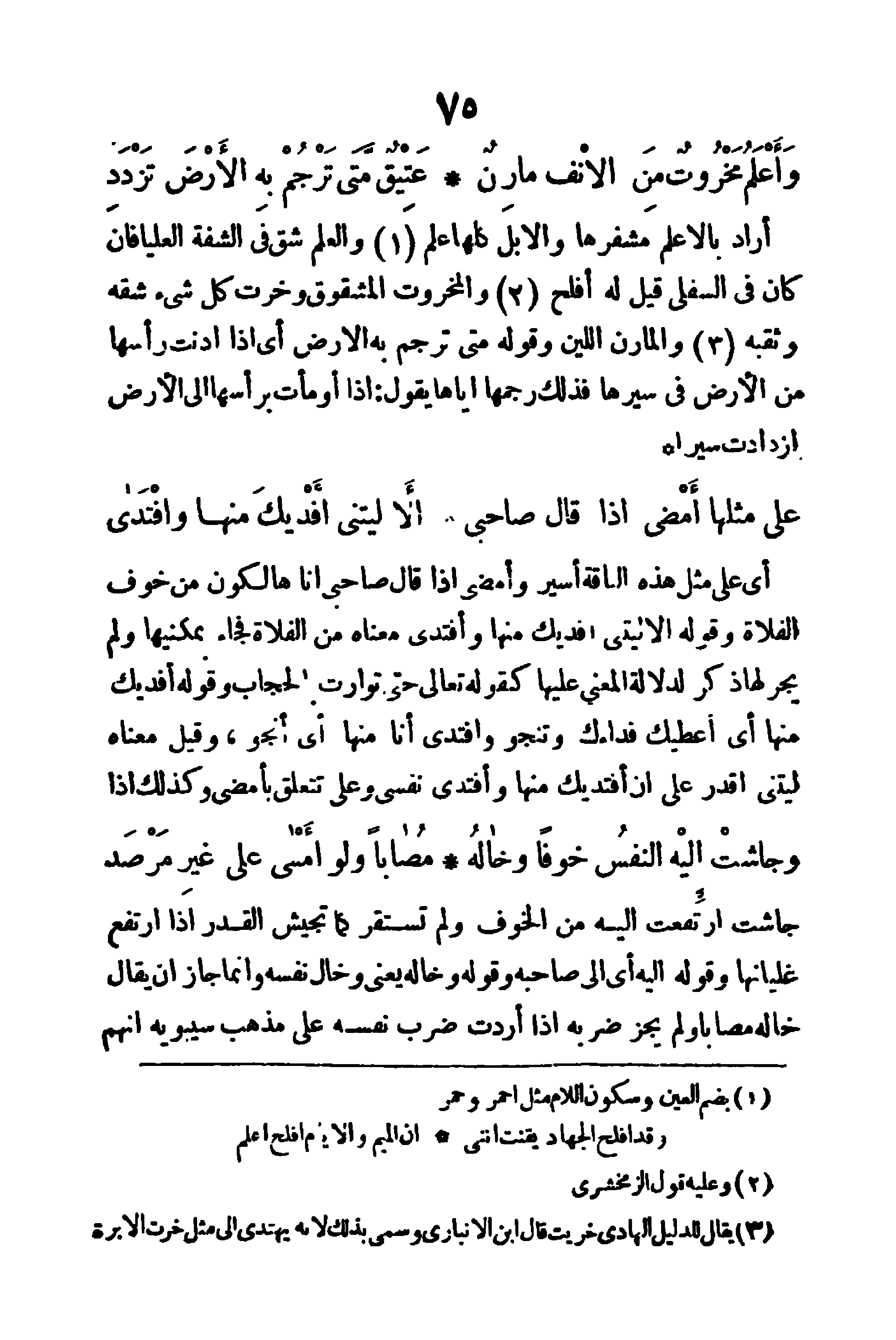 أي على مثل هذه الناقة أسير وأمضي إذا قال صاحبي: إنا هالكون من خوف الفلاة، وقوله (ألا ليتني أفديك منها وأفتدى) معناه من الفلاة. فجاء بمكنيها ولم يجر لها ذكر لدلالة المعنى عليها، كقوله تعالى (حَتَّى تَوَارَتْ بِالحِجْاب)، وقوله (أفديك منها) أي أعطيك فداءك وتنجو، وأفتدى أنا منها: أي أنجو، وقيل: معناه ليتني أقدر على أن أفتديك منها وأفتدى نفسي، و (على) تتعلق بأمضى، وكذلك إذا.