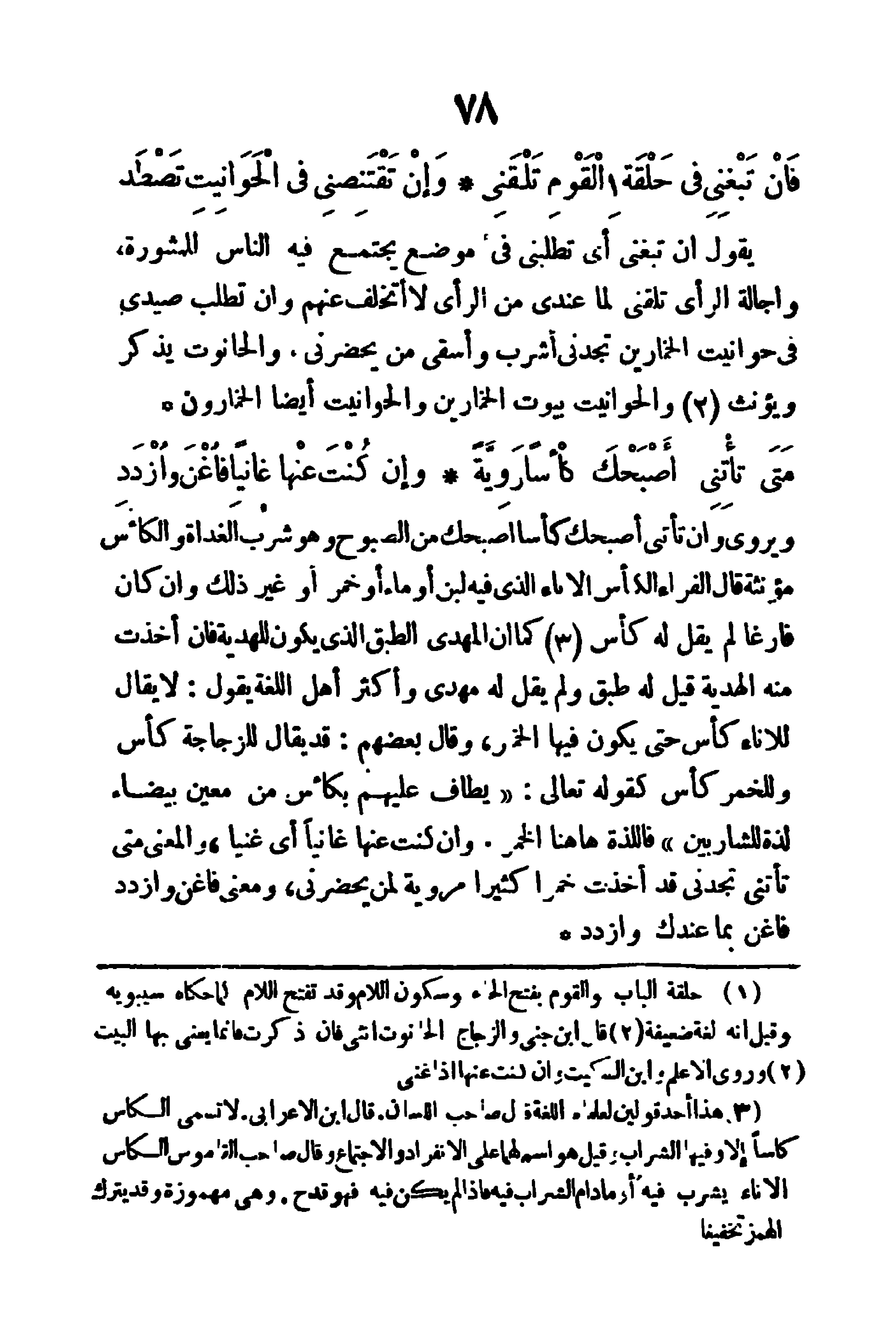 يقول: أن تبغني - أي تطلبني - في موضع يجتمع فيه الناس للمشورة وإجالة الرأي تلقني؛ لما عندي من الرأي، لا أتخلف عنهم، وإن تطلب صيدي في حوانيت الخمارين تجدني أشرب وأسقي من يحضرني، والحانوت: يذكر ويؤنث والحوانيت: بيوت الخمارين، والحوانيت أيضا: الخمارون.