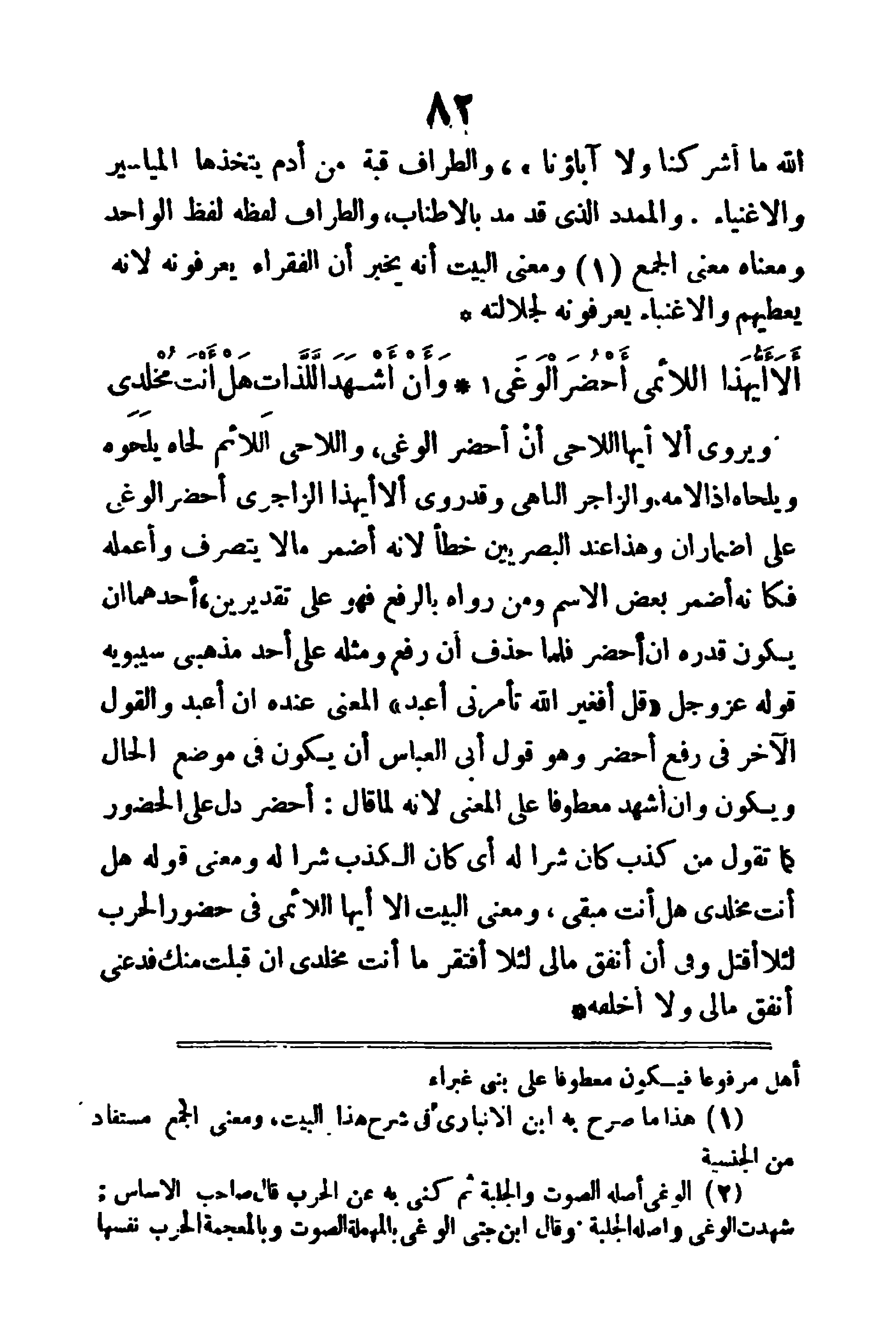 ويروى (أَلا أَيُّها الّلاحِي أن أَحْضُرُّ الوَغَى)، واللاحي: اللائم، لحاه يلحوه ويلحاه، إذا لامه، والزاجر: الناهي، وقد روى (أَلا أَيُّهذَا الّزاجري أَحْضُرَ الوَغَى) على إضمار أن، وهذا عند البصريين خطأ؛ لأنه أضمر ما لا يتصرف وأعمله، فكأنه أضمر بعض الاسم، ومن رواه بالرفع فهو على تقديرين، أحدهما أن يكون قدره (أن أحضُر) فلما حذف أن رفع، ومثله على أحد مذهبي سيبويه قوله عز وجل: (قُلْ أَفَغَيْرَ اللهِ تأمُرُونِّي أعْبُدُ) المعنى عنده أن أعبد، والقول الآخر في رفع (أحضر) - وهو قول أبي العباس - أن يكون في موضع الحال، ويكون (وأن أشهد) معطوفا على المعنى؛ لأنه لما قال: (أحضر) دل على الحضور كمما تقول: من كذب كان شرا له، أي كان الكذب شرا له، ومعنى قوله: (هل أنت مُخلدي)