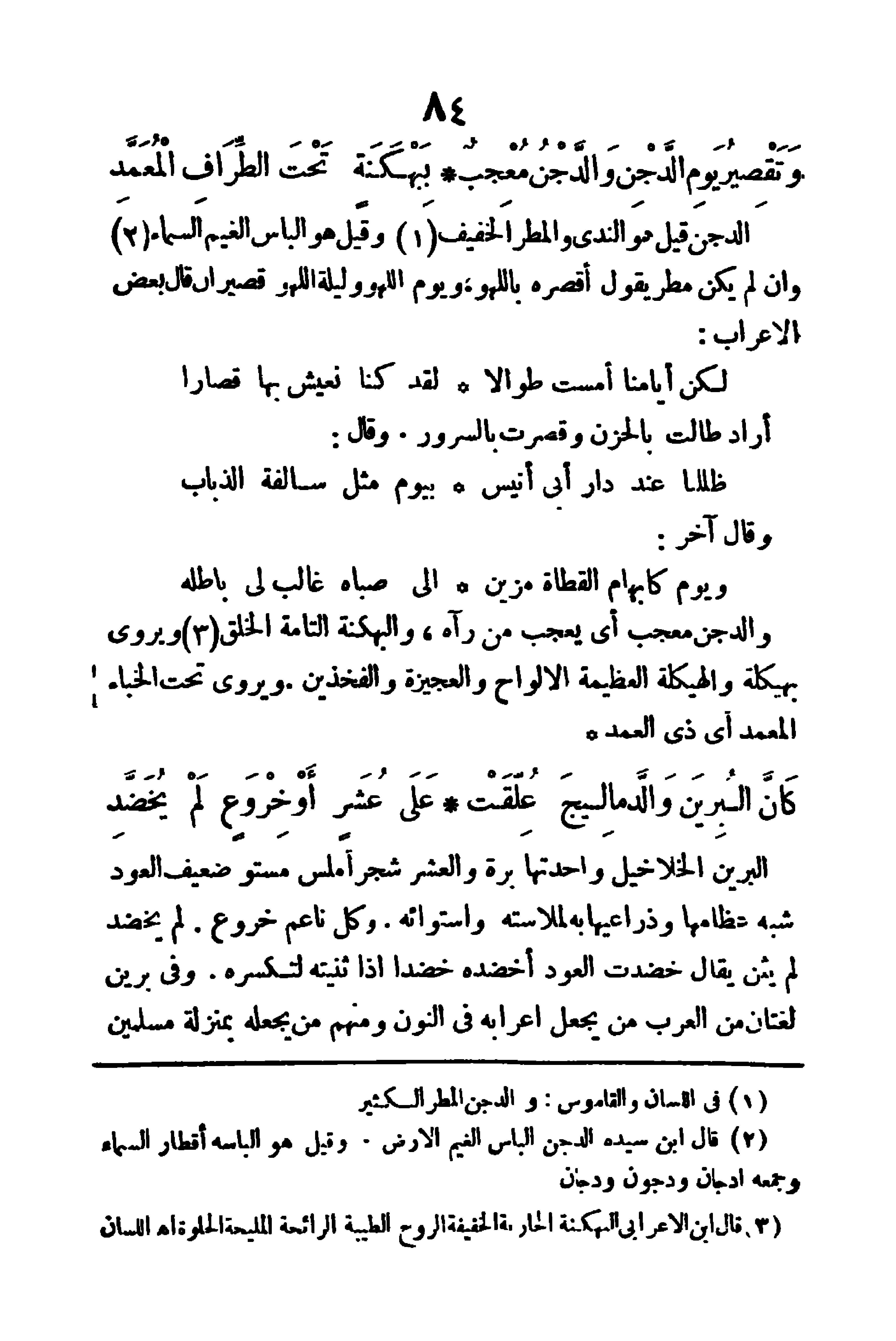 (وَتَقَصْيرُ يَوْمِ الدَّجْنِ والدَّجْنُ مُعْجِبٌ ... بِبَهْكَنَةٍ تَحْتَ الطِّرَافِ المُعَمَّدِ)