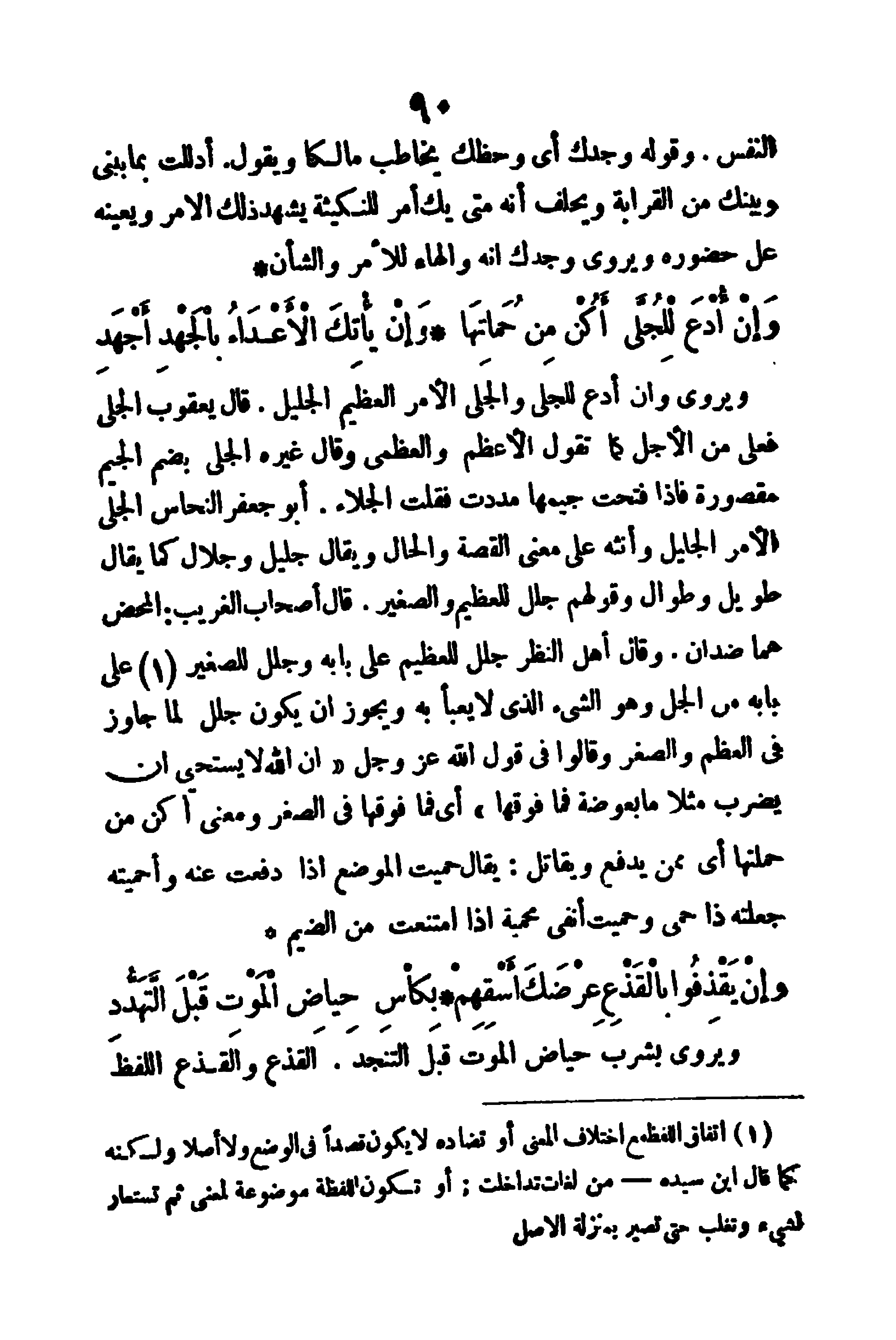 وأنثه على معنى القصة والحال، ويقال: جليل وجلال، كما يقال: طويل وطوال، وقولهم جلل للعظيم والصغير، قال أصحاب الغريب المحض: هما ضدان، وقال أهل النظر: جلل للعظيم على بابه وجلل للصغير على بابه من الجل وهو الشيء الذي لا يُعبأ به، ويجوز أن يكون جلل لما جاوز في العظم والصغر، وقالوا في قول الله عز وجل: (إِنَّ اللهَ لاَ يَستَحِي أن يَضْرِبَ مَثَلاَ مَا بَعُوضَةً فمَا فَوْقَهَا) أي فما فوقها في الصغر، ومعنى: (أكُنْ من حماتها) أي ممن يدفع ويقاتل، يقال: حميت الموضع؛ إذا دفعت عنه، وأحميته: جعلته ذا حمى، ووحميت أنفي محمية، إذا استنعت من الضيم.