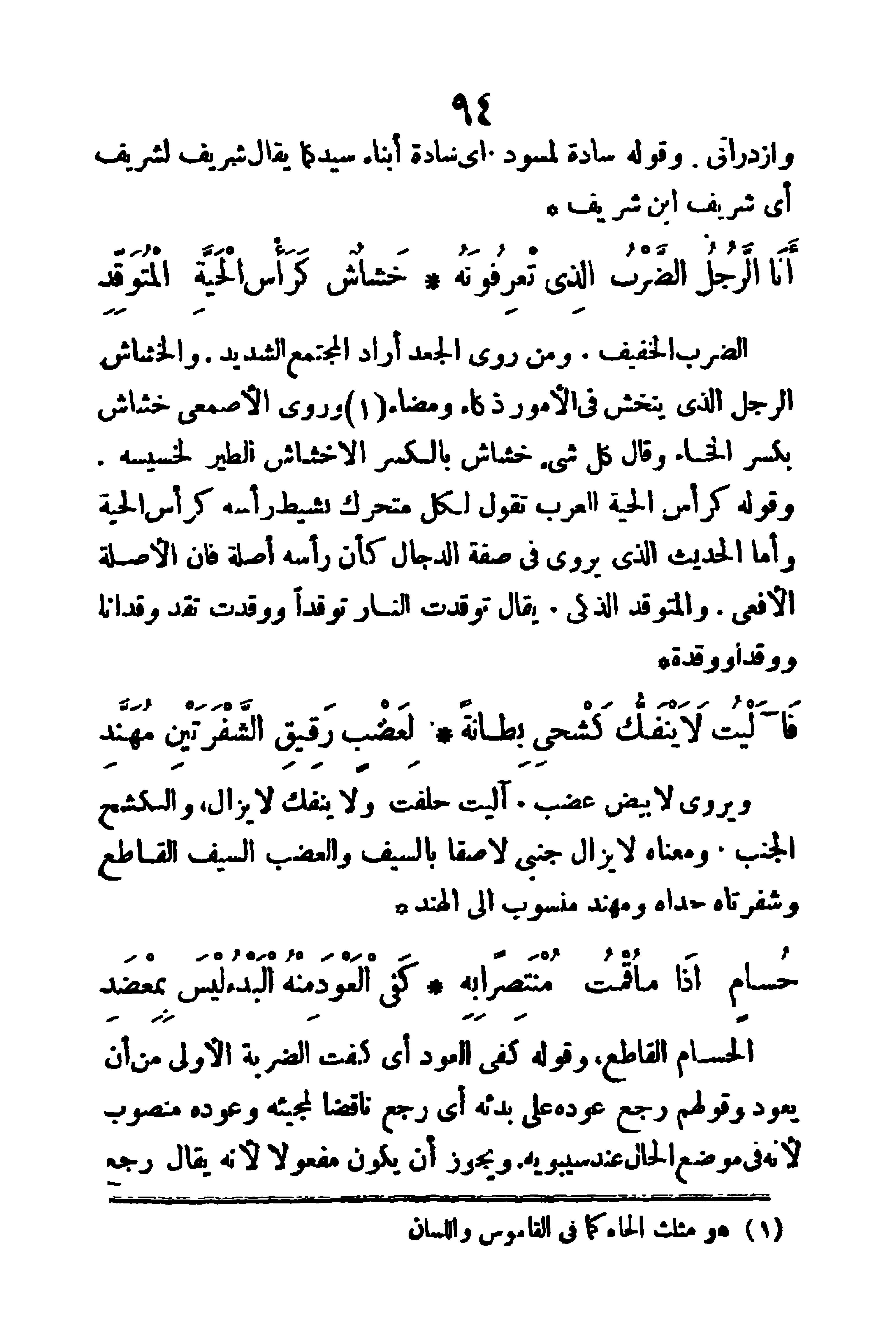الضَّرْبُ: الخفيف، ومن روى (الجعد) أراد المجتمع الشديد والخشاش: الرجل الذي ينخش في الأمور ذكاء ومضاء، وروى الأصمعي خِشاش بكسر الخاء، وقال: كل شيء خِشاش بالكسر إلا خَشاش الطير لخسيسه. وقوله (كرأس الحية) العرب تقول لكل متحرك نشيط: رأسه كرأس الحية، وأما الحديث الذي يروى في صفة الدجال (كأن رأسه أصلة) فإن الأصلة الأفعى، والمتوقد: الذكي، يقال: توقدت النار توقدا ووقدت تقد وقدانا ووقدا وقدة.