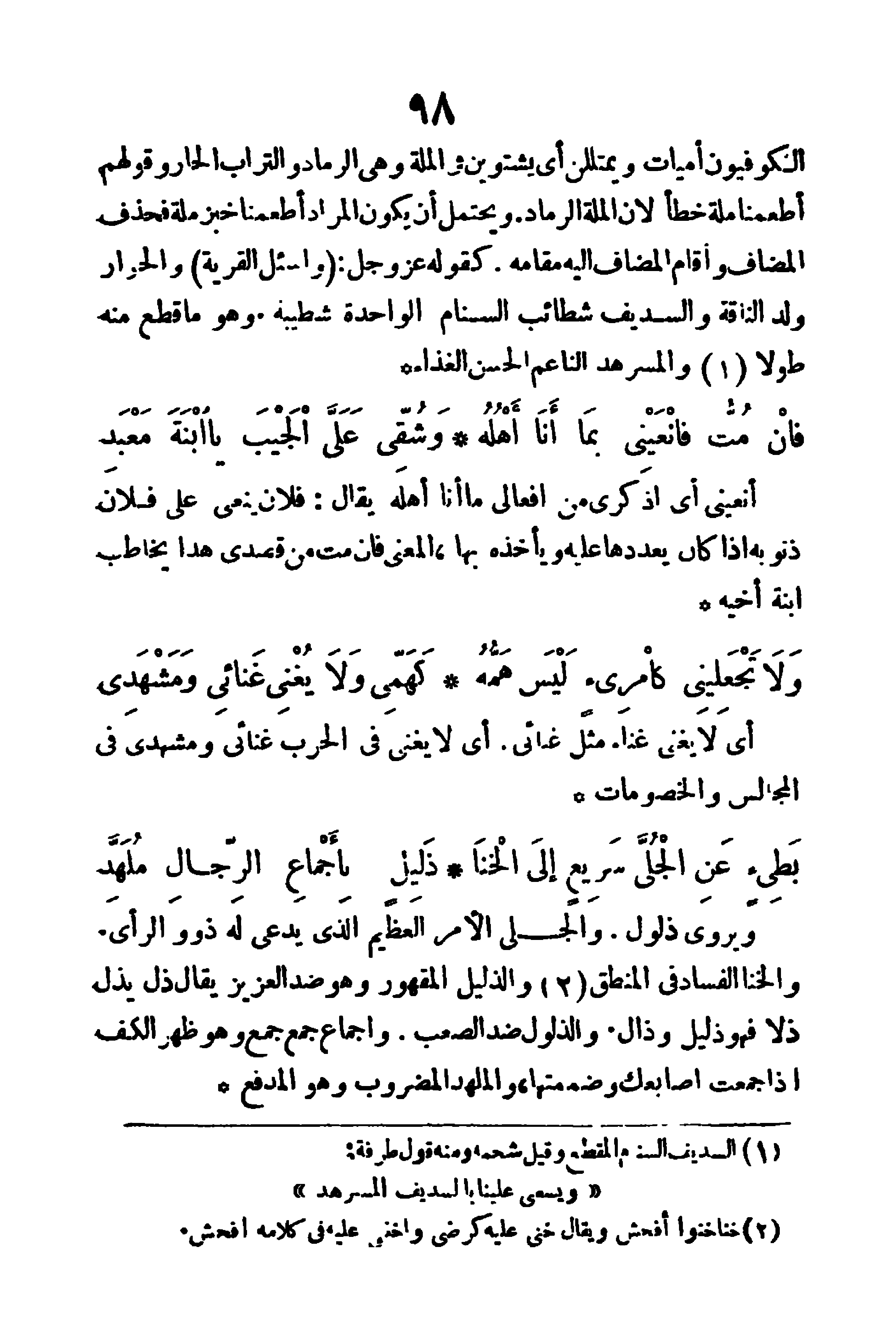 الكوفيون أميات، و (يمتللن) أي يشتوين في الملة، وهي الرماد والتراب الحار، وقولهم (أطعمنا ملة) خطأ)؛ لأن الملة الرماد، ويحتمل أن يكون المراد أطعمنا خبز ملة، فحذف المضاف وأقام المضاف إليه مقامه، كقوله عز وجل: (واسْأَلِ القَرْيَةَ) والحوار: ولد الناقة، والسديف: شطائب السنام، الواحدة شطيبة، وهو ما قطع منه طولا، والمسرهد: الناعم الحسن الغذاء.