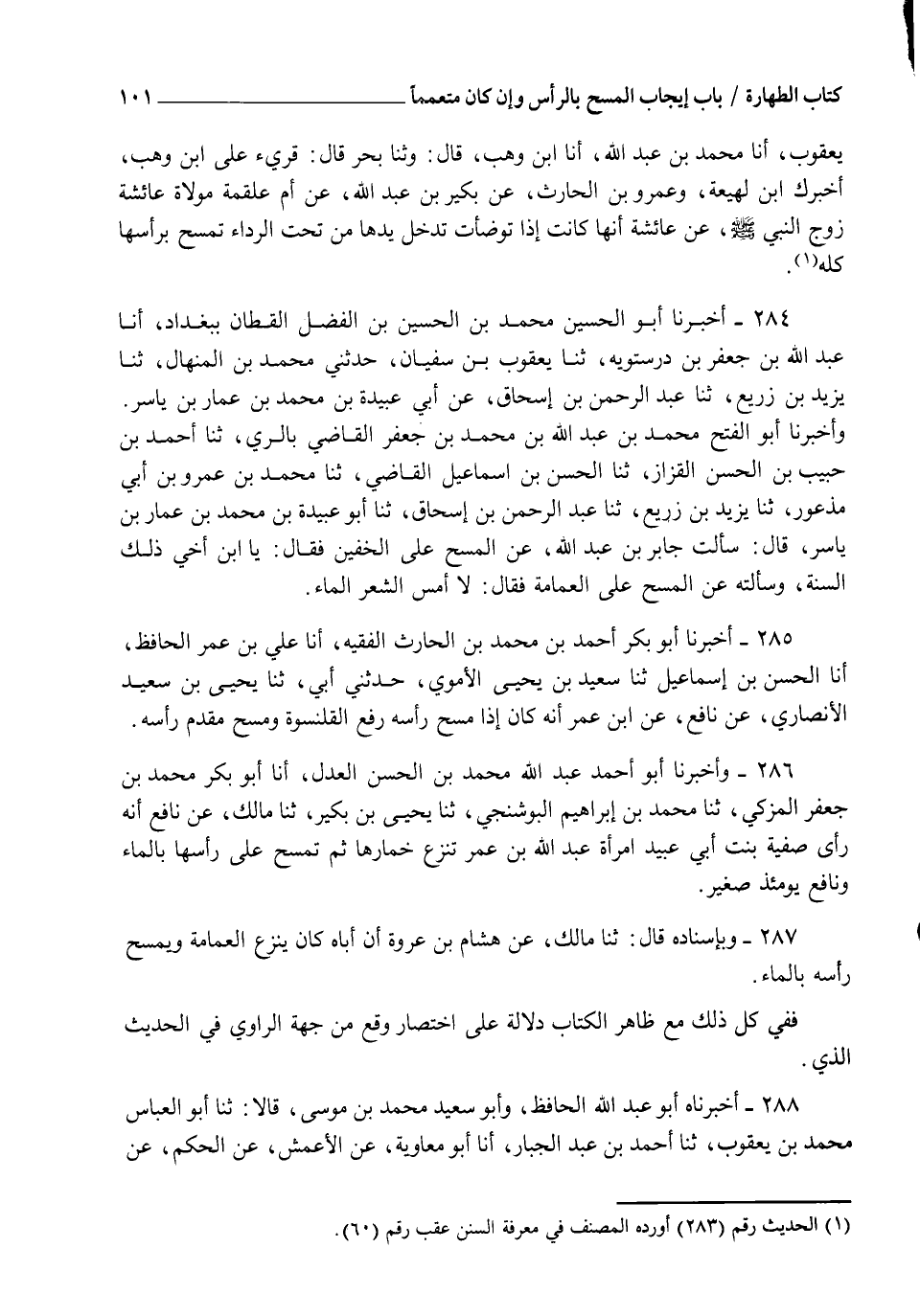 284 - أَخْبَرَنَا أَبُو الْحُسَيْنِ مُحَمَّدُ بْنُ الْحُسَيْنِ بْنِ الْفَضْلِ الْقَطَّانُ بِبَغْدَادَ، أنا عَبْدُ اللهِ بْنُ جَعْفَرِ بْنِ دُرُسْتُوَيْهِ، ثنا يَعْقُوبُ بْنُ سُفْيَانَ، حَدَّثَنِي مُحَمَّدُ بْنُ الْمِنْهَالِ، ثنا يَزِيدُ بْنُ زُرَيْعٍ، ثنا عَبْدُ الرَّحْمَنِ بْنُ إِسْحَاقَ، عَنْ أَبِي عُبَيْدَةَ بْنِ مُحَمَّدِ بْنِ عَمَّارِ بْنِ يَاسِرٍ، وَأَخْبَرَنَا أَبُو الْفَتْحِ مُحَمَّدُ بْنُ عَبْدِ اللهِ بْنِ مُحَمَّدِ بْنِ جَعْفَرٍ الْقَاضِي بِالرِّيِّ، ثنا أَحْمَدُ بْنُ حَبِيبِ بْنِ الْحَسَنِ الْقَزَّازُ، ثنا الْحَسَنُ بْنُ إِسْمَاعِيلَ الْقَاضِي، ثنا مُحَمَّدُ بْنُ عَمْرِو بْنِ أَبِي مَذْعُورٍ، ثنا يَزِيدُ بْنُ زُرَيْعٍ، ثنا عَبْدُ الرَّحْمَنِ بْنُ إِسْحَاقَ، ثنا أَبُو عُبَيْدَةَ بْنُ مُحَمَّدِ بْنِ عَمَّارِ بْنِ يَاسِرٍ، قَالَ: سَأَلْتُ جَابِرَ بْنَ عَبْدِ اللهِ عَنِ الْمَسْحِ عَلَى الْخُفَّيْنِ، فَقَالَ: " يَا ابْنَ أَخِي ذَلِكَ السُّنَّةُ ". وَسَأَلْتُهُ عَنِ الْمَسْحِ عَلَى الْعِمَامَةِ فَقَالَ: " §لَا، أَمِسَّ الشَّعْرَ الْمَاءَ "