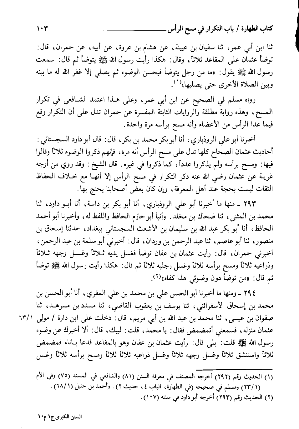 293 - مِنْهَا مَا أَخْبَرَنَا أَبُو عَلِيٍّ الرُّوذْبَارِيُّ، أنا أَبُو بَكْرِ بْنُ دَاسَةَ، أنا أَبُو دَاوُدَ، ثنا مُحَمَّدُ بْنُ الْمُثَنَّى، ثنا ضَحَّاكُ بْنُ مَخْلَدٍ، وَأنبأ أَبُو حَازِمٍ الْحَافِظُ، وَاللَّفْظُ لَهُ، وَأَخْبَرَنَا أَبُو أَحْمَدَ الْحَافِظُ، أنا أَبُو بَكْرٍ عَبْدُ اللهِ بْنُ سُلَيْمَانَ بْنِ الْأَشْعَثِ السِّجِسْتَانِيُّ بِبَغْدَادَ، حَدَّثَنَا إِسْحَاقُ بْنُ مَنْصُورٍ، ثنا أَبُو عَاصِمٍ، ثنا عَبْدُ الرَّحْمَنِ بْنُ وَرْدَانَ، قَالَ: أَخْبَرَنِي أَبُو سَلَمَةَ بْنُ عَبْدِ الرَّحْمَنِ، أَخْبَرَنِي حُمْرَانُ، قَالَ: رَأَيْتُ عُثْمَانَ بْنَ عَفَّانَ تَوَضَّأَ فَغَسَلَ يَدَيْهِ ثَلَاثًا، وَغَسَلَ وَجْهَهُ ثَلَاثًا وَذِرَاعَيْهِ ثَلَاثًا، وَمَسَحَ بِرَأْسِهِ ثَلَاثًا، وَغَسَلَ رِجْلَيْهِ ثَلَاثًا، ثُمَّ قَالَ: هَكَذَا رَأَيْتُ رَسُولَ اللهِ صَلَّى اللهُ عَلَيْهِ وَسَلَّمَ تَوَضَّأَ ثُمَّ قَالَ: §" مَنْ تَوَضَّأَ دُونَ وُضُوئِي هَذَا كَفَاهُ "