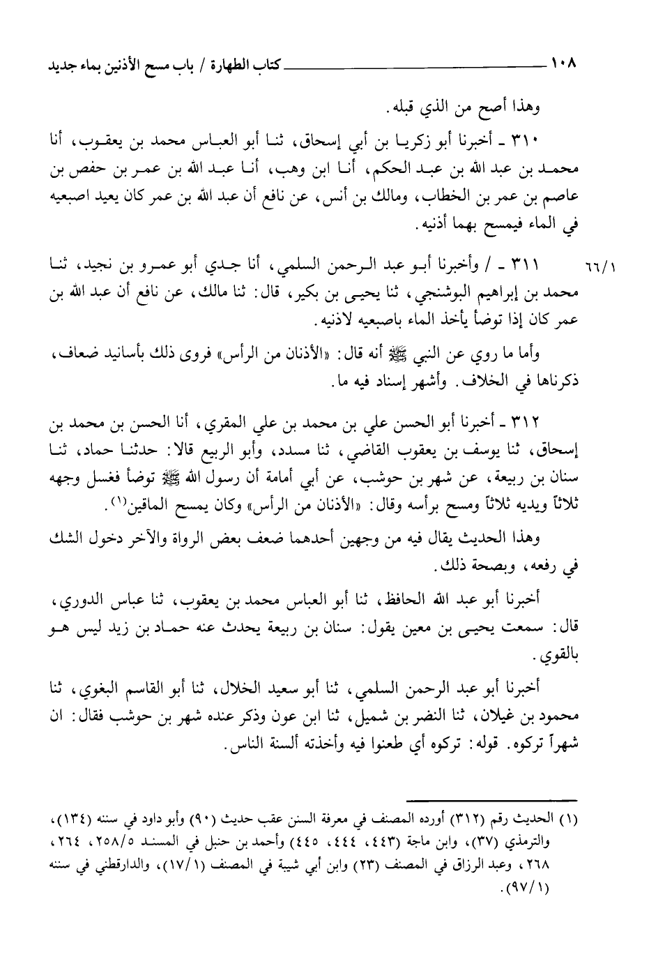 311 - وَأَخْبَرَنَا أَبُو عَبْدِ الرَّحْمَنِ السُّلَمِيُّ، أنا جَدِّي أَبُو عَمْرِو بْنُ نُجَيْدٍ، ثنا مُحَمَّدُ بْنُ إِبْرَاهِيمَ الْبُوشَنْجِيُّ، ثنا يَحْيَى بْنُ بُكَيْرٍ، قَالَ: ثنا مَالِكٌ، عَنْ نَافِعٍ، أَنَّ عَبْدَ اللهِ بْنَ عُمَرَ، كَانَ إِذَا تَوَضَّأَ يَأْخُذُ الْمَاءَ بِأُصْبُعَيْهِ لِأُذُنَيْهِ، وَأَمَّا مَا رُوِيَ عَنِ النَّبِيِّ صَلَّى اللهُ عَلَيْهِ وَسَلَّمَ أَنَّهُ قَالَ: §" الْأُذُنَانِ مِنَ الرَّأْسِ ". فَرُوِيَ ذَلِكَ بِأَسَانِيدَ ضِعَافٍ ذَكَرْنَاهَا فِي الْخِلَافِ