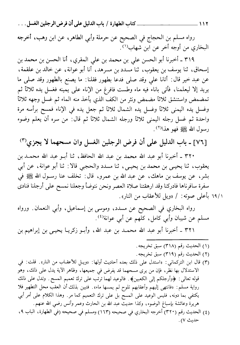 320 - أَخْبَرَنَا أَبُو عَبْدِ اللهِ مُحَمَّدُ بْنُ عَبْدِ اللهِ الْحَافِظُ، ثنا أَبُو عَبْدِ اللهِ مُحَمَّدُ بْنُ يَعْقُوبَ، ثنا يَحْيَى بْنُ مُحَمَّدِ بْنِ يَحْيَى، ثنا مُسَدَّدٌ، وَالْحَجَبِيُّ، قَالَا: ثنا أَبُو عَوَانَةَ، عَنْ أَبِي بِشْرٍ، عَنْ يُوسُفَ بْنِ مَاهَكَ، عَنْ عَبْدِ اللهِ بْنِ عَمْرٍو، قَالَ: تَخَلَّفَ عَنْا رَسُولُ اللهِ صَلَّى اللهُ عَلَيْهِ وَسَلَّمَ فِي سَفْرَةٍ سَافَرْنَاهَا، فَأَدْرَكَنَا وَقَدْ أَرْهَقَتْنَا صَلَاةُ الْعَصْرِ، وَنَحْنُ نَتَوَضَّأُ وَجَعَلْنَا نَمْسَحُ عَلَى أَرْجُلِنَا، فَنَادَى بِأَعْلَى صَوْتِهِ: §" وَيْلٌ لِلْأَعْقَابِ مِنَ النَّارِ ". رَوَاهُ الْبُخَارِيُّ فِي الصَّحِيحِ، عَنْ مُسَدَّدٍ، وَمُوسَى بْنِ إِسْمَاعِيلَ، وَأَبِي النُّعْمَانِ، وَرَوَاهُ مُسْلِمٌ، عَنْ شَيْبَانَ وَأَبِي كَامِلٍ، كُلُّهُمْ عَنْ أَبِي عَوَانَةَ