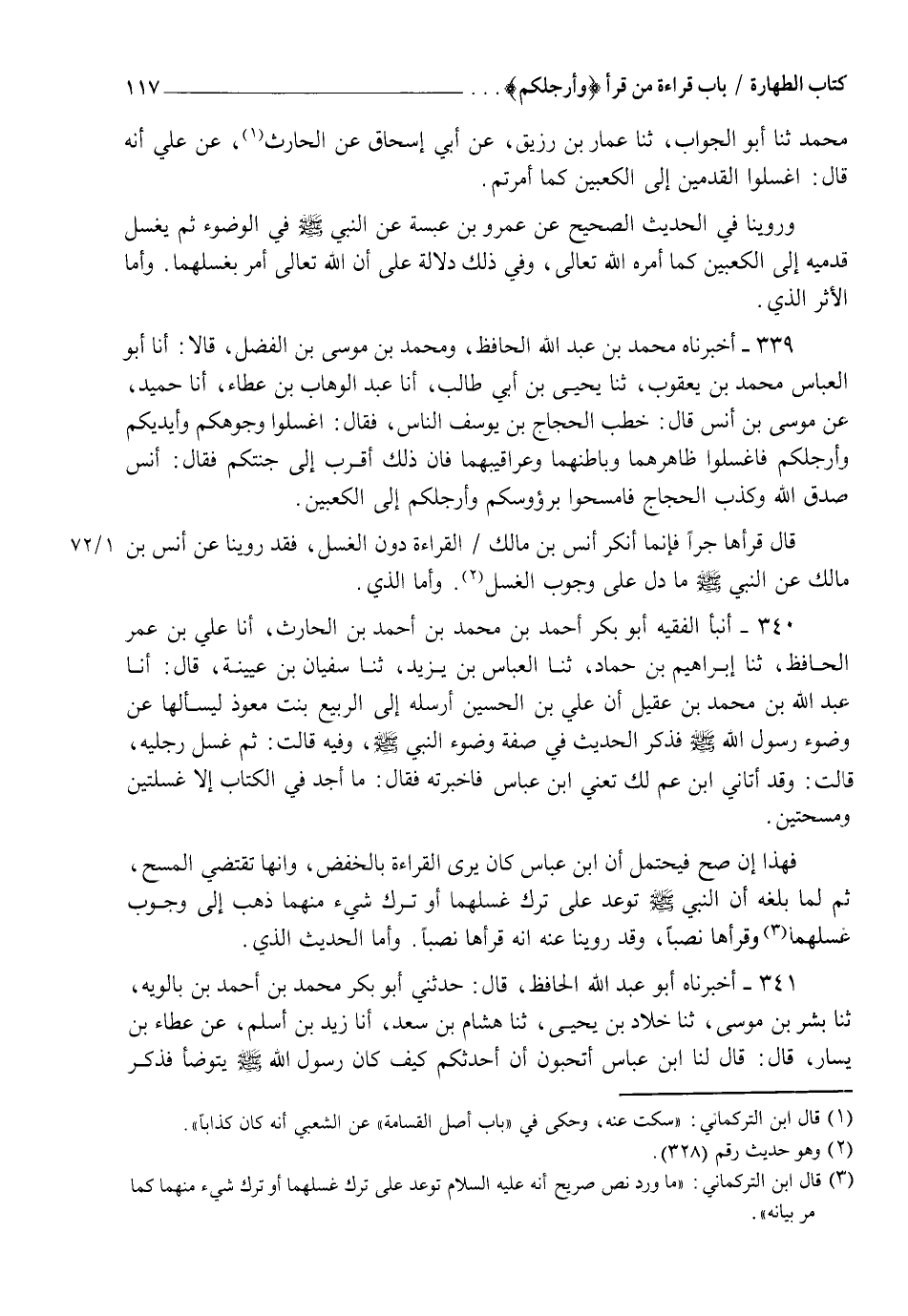 340 - أنبأ الْفَقِيهُ أَبُو بَكْرٍ أَحْمَدُ بْنُ مُحَمَّدِ بْنِ أَحْمَدَ بْنِ الْحَارِثِ، أنا عَلِيُّ بْنُ عُمَرَ الْحَافِظُ، ثنا إِبْرَاهِيمُ بْنُ حَمَّادٍ، ثنا الْعَبَّاسُ بْنُ يَزِيدَ، ثنا سُفْيَانُ بْنُ عُيَيْنَةَ، قَالَ: أنا عَبْدُ اللهِ بْنُ مُحَمَّدِ بْنِ عَقِيلٍ، أَنَّ عَلِيَّ بْنَ الْحُسَيْنِ أَرْسَلَهُ إِلَى الرُّبَيِّعِ بِنْتِ مُعَوِّذٍ لِيَسْأَلَهَا عَنْ وُضُوءِ رَسُولِ اللهِ صَلَّى اللهُ عَلَيْهِ وَسَلَّمَ، فَذَكَرَ الْحَدِيثَ فِي صِفَةِ وُضُوءِ النَّبِيِّ صَلَّى اللهُ عَلَيْهِ وَسَلَّمَ، وَفِيهِ قَالَتْ: §ثُمَّ غَسَلَ رِجْلَيْهِ. قَالَتْ: وَقَدْ أَتَانِي ابْنُ عَمٍّ لَكَ تَعْنِي ابْنَ عَبَّاسٍ فَأَخْبَرْتُهُ، فَقَالَ: مَا أَجِدُ فِي الْكِتَابِ إِلَّا غَسْلَتَيْنِ وَمَسْحَتَيْنِ. فَهَذَا إِنْ صَحَّ فَيُحْتَمَلُ أَنَّ ابْنَ عَبَّاسٍ كَانَ يَرَى الْقِرَاءَةَ بِالْخَفْضِ، وَأَنَّهَا تَقْتَضِي الْمَسْحَ، ثُمَّ لَمَّا بَلَغَهُ أَنَّ النَّبِيَّ صَلَّى اللهُ عَلَيْهِ وَسَلَّمَ تَوَعَّدَ عَلَى تَرْكِ غَسْلِهِمَا أَوْ تَرْكِ شَيْءٍ مِنْهُمَا ذَهَبَ إِلَى وُجُوبِ غَسْلِهِمَا، وَقَرَأَهَا نَصْبًا. وَقَدْ رُوِّينَا عَنْهُ أَنَّهُ قَرَأَهَا نَصْبًا