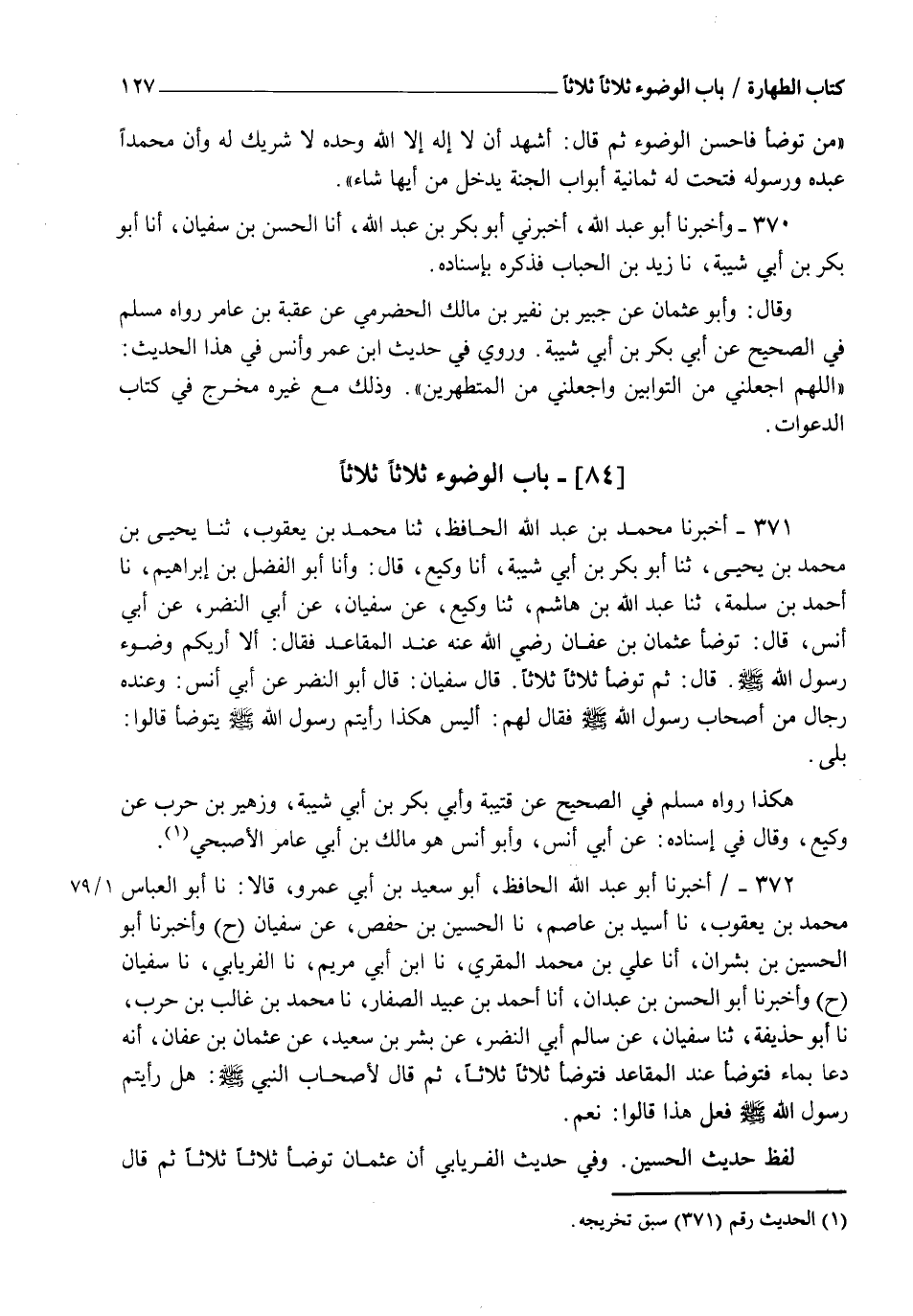 371 - أَخْبَرَنَا مُحَمَّدُ بْنُ عَبْدِ اللهِ الْحَافِظُ، ثنا مُحَمَّدُ بْنُ يَعْقُوبَ، ثنا يَحْيَى بْنُ مُحَمَّدِ بْنِ يَحْيَى، ثنا أَبُو بَكْرِ بْنُ أَبِي شَيْبَةَ، أنا وَكِيعٌ، قَالَ: وَأنا أَبُو الْفَضْلِ بْنُ إِبْرَاهِيمَ، نا أَحْمَدُ بْنُ سَلَمَةَ، ثنا عَبْدُ اللهِ بْنُ هَاشِمٍ، ثنا وَكِيعٌ، عَنْ سُفْيَانَ، عَنْ أَبِي النَّضْرِ، عَنْ أَبِي أَنَسٍ، قَالَ: تَوَضَّأَ عُثْمَانُ بْنُ عَفَّانَ رَضِيَ اللهُ عَنْهُ، عِنْدَ الْمَقَاعِدِ، فَقَالَ: " أَلَا أُرِيكُمْ وُضُوءَ رَسُولِ اللهِ صَلَّى اللهُ عَلَيْهِ وَسَلَّمَ؟ " قَالَ: §ثُمَّ تَوَضَّأَ ثَلَاثًا ثَلَاثًا. قَالَ سُفْيَانُ: قَالَ أَبُو النَّضْرِ، عَنْ أَبِي أَنَسٍ، وَعِنْدَهُ رِجَالٌ مِنْ أَصْحَابِ رَسُولِ اللهِ صَلَّى اللهُ عَلَيْهِ وَسَلَّمَ فَقَالَ لَهُمْ: أَلَيْسَ هَكَذَا رَأَيْتُمْ رَسُولَ اللهِ صَلَّى اللهُ عَلَيْهِ وَسَلَّمَ يَتَوَضَّأُ؟ قَالُوا: بَلَى. هَكَذَا رَوَاهُ مُسْلِمٌ فِي الصَّحِيحِ عَنْ قُتَيْبَةَ، وَأَبِي بَكْرِ بْنِ أَبِي شَيْبَةَ، وَزُهَيْرِ بْنِ حَرْبٍ، عَنْ وَكِيعٍ، وَقَالَ فِي إِسْنَادِهِ: عَنْ أَبِي أَنَسٍ. وَأَبُو أَنَسٍ هُوَ مَالِكُ بْنُ أَبِي عَامِرٍ الْأَصْبَحِيُّ