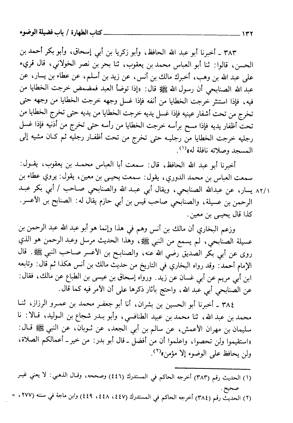 383 - أَخْبَرَنَا أَبُو عَبْدِ اللهِ الْحَافِظُ، وَأَبُو زَكَرِيَّا بْنُ أَبِي إِسْحَاقَ، وَأَبُو بَكْرٍ أَحْمَدُ بْنُ الْحَسَنِ، قَالُوا: ثنا أَبُو الْعَبَّاسِ مُحَمَّدُ بْنُ يَعْقُوبَ، ثنا بَحْرُ بْنُ نَصْرٍ الْخَوْلَانِيُّ، قَالَ: قُرِئَ عَلَى عَبْدِ اللهِ بْنِ وَهْبٍ: أَخْبَرَكَ مَالِكُ بْنُ أَنَسٍ، عَنْ زَيْدِ بْنِ أَسْلَمَ، عَنْ عَطَاءِ بْنِ يَسَارٍ، عَنْ عَبْدِ اللهِ الصُّنَابِحِيِّ، أَنَّ رَسُولَ اللهِ صَلَّى اللهُ عَلَيْهِ وَسَلَّمَ قَالَ: " §إِذَا تَوَضَّأَ الْعَبْدُ فَمَضْمَضَ خَرَجَتِ الْخَطَايَا مِنْ فِيهِ، فَإِذَا اسْتَنْثَرَ خَرَجَتِ الْخَطَايَا مِنْ أَنْفِهِ، فَإِذَا غَسَلَ وَجْهَهُ خَرَجَتِ الْخَطَايَا مِنْ وَجْهِهِ حَتَّى تَخْرُجَ مِنْ تَحْتِ أَشْفَارِ عَيْنَيْهِ، فَإِذَا غَسَلَ يَدَيْهِ خَرَجَتِ الْخَطَايَا مَنْ يدَيْهِ حَتَّى تَخْرُجَ الْخَطَايَا مِنْ تَحْتِ أَظْفَارِ يَدَيْهِ، فَإِذَا مَسَحَ بِرَأْسِهِ خَرَجَتِ الْخَطَايَا مِنْ رَأْسِهِ حَتَّى تَخْرُجَ مِنْ أُذُنَيْهِ، فَإِذَا غَسَلَ رِجْلَيْهِ خَرَجَتِ الْخَطَايَا مِنْ رِجْلَيْهِ حَتَّى تَخْرُجَ مِنْ تَحْتِ أَظْفَارِ رِجْلَيْهِ، ثُمَّ كَانَ مَشْيُهُ إِلَى الْمَسْجِدِ وَصَلَاتُهُ نَافِلَةً لَهُ ". أَخْبَرَنَا أَبُو عَبْدِ اللهِ الْحَافِظُ قَالَ: سَمِعْتُ أَبَا الْعَبَّاسِ مُحَمَّدُ بْنُ يَعْقُوبَ، يَقُولُ: سَمِعْتُ الْعَبَّاسَ بْنَ مُحَمَّدٍ الدُّورِيُّ، يَقُولُ: سَمِعْتُ يَحْيَى بْنَ مَعِينٍ يَقُولُ: يَرْوِي عَطَاءُ بْنُ يَسَارٍ عَنْ عَبْدِ اللهِ الصُّنَابِحِيِّ وَيُقَالُ: أَبُو عَبْدِ اللهِ، وَالصُّنَابِحِيُّ صَاحِبُ أَبِي بَكْرٍ عَبْدُ الرَّحْمَنِ بْنُ عُسَيْلَةَ، وَالصُّنَابِحِيُّ صَاحِبُ قَيْسِ بْنِ أَبِي حَازِمٍ يُقَالُ لَهُ: الصُّنَابِحُ بْنُ الْأَعْسَرِ، كَذَا قَالَ يَحْيَى بْنُ مَعِينٍ. وَزَعَمَ الْبُخَارِيُّ أَنَّ مَالِكَ بْنَ أَنَسٍ وَهِمَ فِي هَذَا، وَإِنَّمَا هُوَ أَبُو عَبْدِ اللهِ عَبْدُ الرَّحْمَنِ بْنُ عُسَيْلَةَ الصُّنَابِحِيُّ لَمْ يسْمَعْ مِنَ النَّبِيِّ صَلَّى اللهُ عَلَيْهِ وَسَلَّمَ، وَهَذَا الْحَدِيثُ مُرْسَلٌ وَعَبْدُ الرَّحْمَنِ هُوَ الَّذِي رَوَى عَنْ أَبِي بَكْرٍ الصِّدِّيقِ رَضِيَ اللهُ عَنْهُ، وَالصُّنَابِحُ بْنُ الْأَعْسَرِ صَاحِبُ النَّبِيِّ صَلَّى اللهُ عَلَيْهِ وَسَلَّمَ قَالَ الْإِمَامُ أَحْمَدُ: وَقَدْ رَوَاهُ الْبُخَارِيُّ فِي التَّارِيخِ مِنْ حَدِيثِ مَالِكِ بْنِ أَنَسٍ هَكَذَا، ثُمَّ قَالَ: وَتَابَعَهُ ابْنُ أَبِي مَرْيَمَ، عَنْ أَبِي غَسَّانَ، عَنْ زَيْدٍ. وَرَوَاهُ إِسْحَاقُ بْنُ عِيسَى بْنِ الطَّبَّاعِ، عَنْ مَالِكٍ، فَقَالَ: عَنِ الصُّنَابِحِيِّ أَبِي عَبْدِ اللهِ، وَاحْتَجَّ بِآثَارٍ ذَكَرَهَا عَلَى أَنَّ الْأَمْرَ فِيهِ كَمَا قَالَ