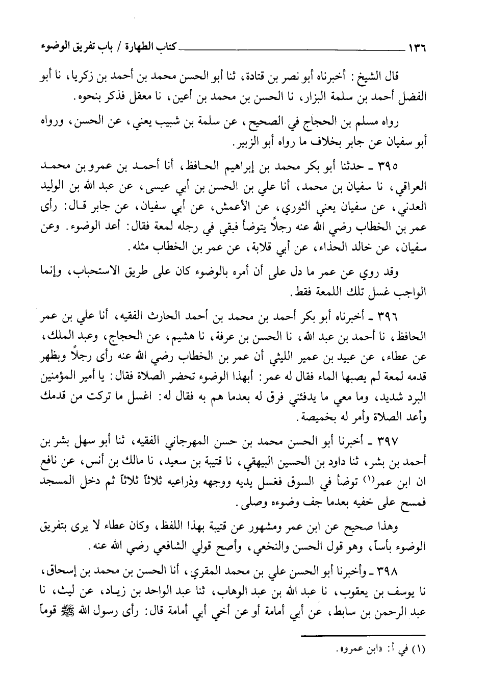 395 - حَدَّثَنَا أَبُو بَكْرٍ مُحَمَّدُ بْنُ إِبْرَاهِيمَ الْحَافِظُ، أنا أَحْمَدُ بْنُ عَمْرِو بْنِ مُحَمَّدٍ الْعِرَاقِيُّ، نا سُفْيَانُ بْنُ مُحَمَّدٍ، أنا عَلِيُّ بْنُ الْحَسَنِ بْنِ أَبِي عِيسَى، عَنْ عَبْدِ اللهِ بْنِ الْوَلِيدِ الْعَدَنِيِّ، عَنْ سُفْيَانَ يَعْنِي الثَّوْرِيَّ، عَنِ الْأَعْمَشِ، عَنْ أَبِي سُفْيَانَ، عَنْ جَابِرٍ، قَالَ: رَأَى عُمَرُ بْنُ الْخَطَّابِ رَضِيَ اللهُ عَنْهُ رَجُلًا يَتَوَضَّأُ، فَبَقِيَ فِي رِجْلِهِ لُمْعَةٌ، فَقَالَ: " §أَعِدِ الْوُضُوءَ ". وَعَنْ سُفْيَانَ، عَنْ خَالِدٍ الْحَذَّاءِ، عَنْ أَبِي قِلَابَةَ، عَنْ عُمَرَ بْنِ الْخَطَّابِ مِثْلَهُ، وَقَدْ رُوِيَ، عَنْ عُمَرَ مَا دَلَّ عَلَى أَنَّ أَمْرَهُ بِالْوضُوءِ كَانَ عَلَى طَرِيقِ الِاسْتِحْبَابِ، وَإِنَّمَا الْوَاجِبُ غَسْلُ تِلْكَ اللُّمْعَةِ فَقَطْ