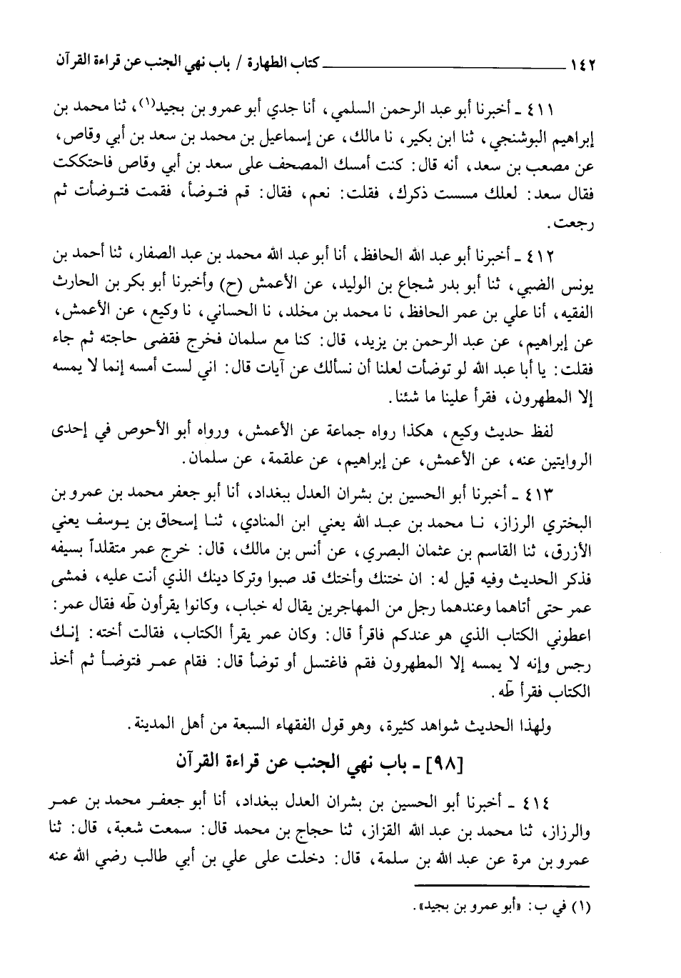 414 - أَخْبَرَنَا أَبُو الْحُسَيْنِ بْنُ بِشْرَانَ الْعَدْلُ بِبَغْدَادَ، أنا أَبُو جَعْفَرٍ مُحَمَّدُ بْنُ عَمْرٍو الرَّزَّازُ، ثنا مُحَمَّدُ بْنُ عَبْدِ اللهِ الْقَزَّازِ، ثنا حَجَّاجُ بْنُ مُحَمَّدٍ، قَالَ: سَمِعْتُ شُعْبَةَ، قَالَ: ثنا عَمْرُو بْنُ مُرَّةَ، عَنْ عَبْدِ اللهِ بْنِ سَلَمَةَ، قَالَ: دَخَلْتُ عَلَى عَلِيِّ بْنِ أَبِي طَالِبٍ رَضِيَ اللهُ عَنْهُ -[143]- أَنَا وَرَجُلَانِ رَجُلٌ مِنْ قَوْمِي وَرَجُلٌ أَحْسَبُهُ مِنْ بَنِي أَسَدٍ، فَبَعَثَهُمَا وَجْهًا وَقَالَ: إِنَّكُمَا عِلْجَانِ فَعَالِجَا عَنْ دِينِكُمَا، ثُمَّ دَخَلَ الْمَخْرَجَ فَقَضَى حَاجَتَهُ، ثُمَّ خَرَجَ، فَأَخَذَ حَفْنَةً مِنْ مَاءٍ، فَمَسَحَ بِهَا، ثُمَّ جَعَلَ يَقْرَأُ الْقُرْآنَ، قَالَ: فَكَأَنَّهُ رَأَى أَنَّا أَنْكَرْنَا ذَلِكَ، فَقَالَ: " كَانَ رَسُولَ اللهِ صَلَّى الله عَلَيْهِ وَسَلَمْ §يقْضِي حَاجَتَهُ فَيَقْرَأُ الْقُرْآنَ وَيَأْكُلُ مَعَنَا اللَّحْمَ، وَلَمْ يكُنْ يَحْجُبُهُ وَرُبَّمَا قَالَ: يَحْجِزُهُ عَنِ الْقُرْآنِ شَيْءٌ لَيْسَ الْجَنَابَةَ". رَوَاهُ أَبُو دَاودَ فِي كِتَابِ السُّنَنِ، عَنْ حَفْصِ بْنِ عُمَرَ، عَنْ شُعْبَةَ، أَخْبَرَنَا أَبُو عَلِيٍّ الرُّوذْبَارِيُّ، أَنَا أَبُو بَكْرِ بْنُ دَاسَةَ، ثنا أَبُو دَاودَ، فَذَكَرَهُ بِمَعْنَاهُ