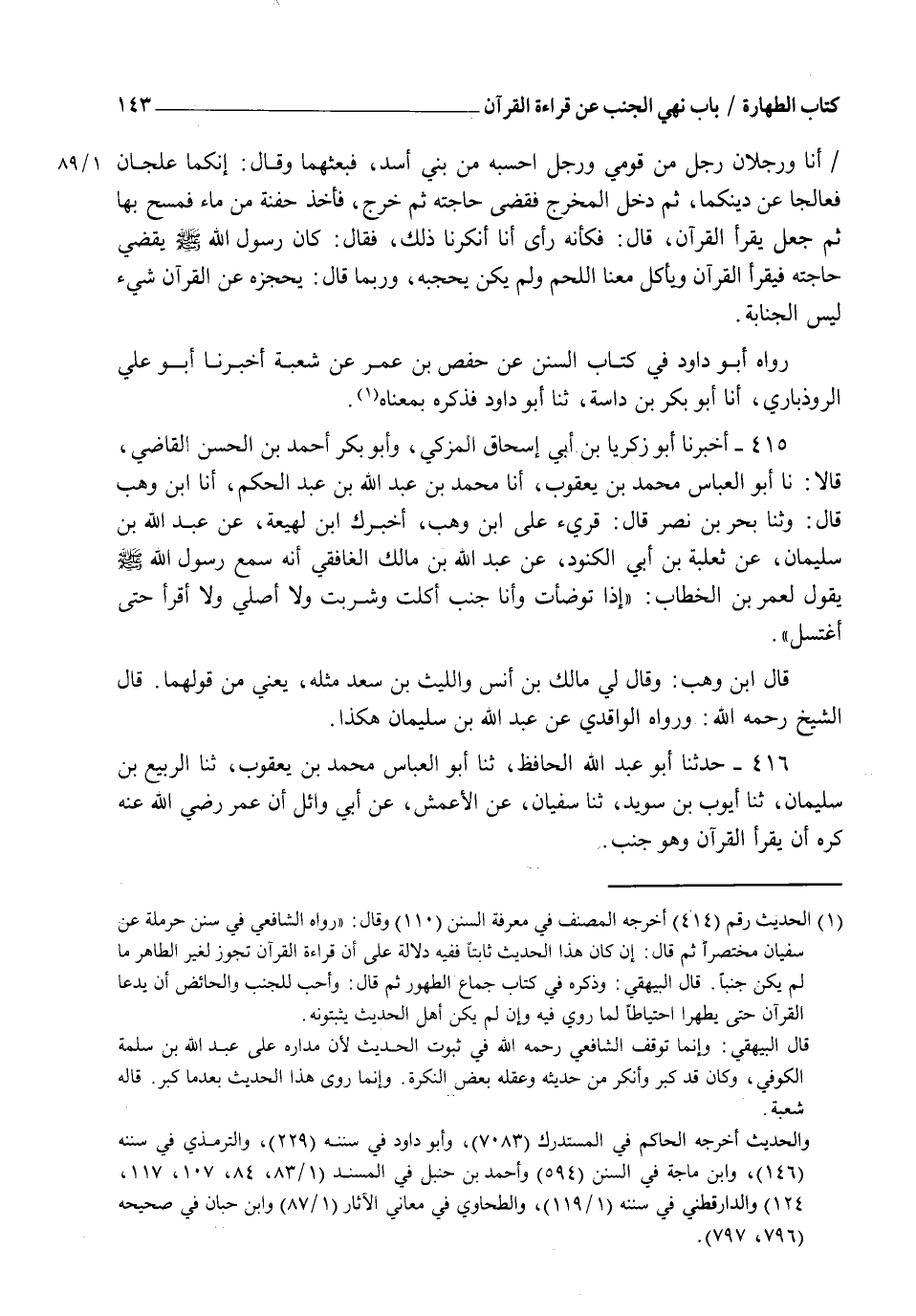 416 - حَدَّثَنَا أَبُو عَبْدِ اللهِ الْحَافِظُ، ثنا أَبُو الْعَبَّاسِ مُحَمَّدُ بْنُ يَعْقُوبَ، ثنا الرَّبِيعُ بْنُ سُلَيْمَانَ، ثنا أَيُّوبُ بْنُ سُوَيْدٍ، ثنا سُفْيَانُ، عَنِ الْأَعْمَشِ، عَنْ أَبِي وَائِلٍ " أَنَّ عُمَرَ رَضِيَ اللهُ عَنْهُ §كَرِهَ أَنْ يَقْرَأَ الْقُرْآنَ وَهُوَ جُنُبٌ ". -[144]- وَرَوَاهُ غَيْرُهُ، عَنِ الثَّوْرِيِّ، عَنِ الْأَعْمَشِ، عَنْ أَبِي وَائِلٍ، عَنْ عُبَيْدَةَ، عَنْ عُمَرَ، وَهُوَ الصَّحِيحُ