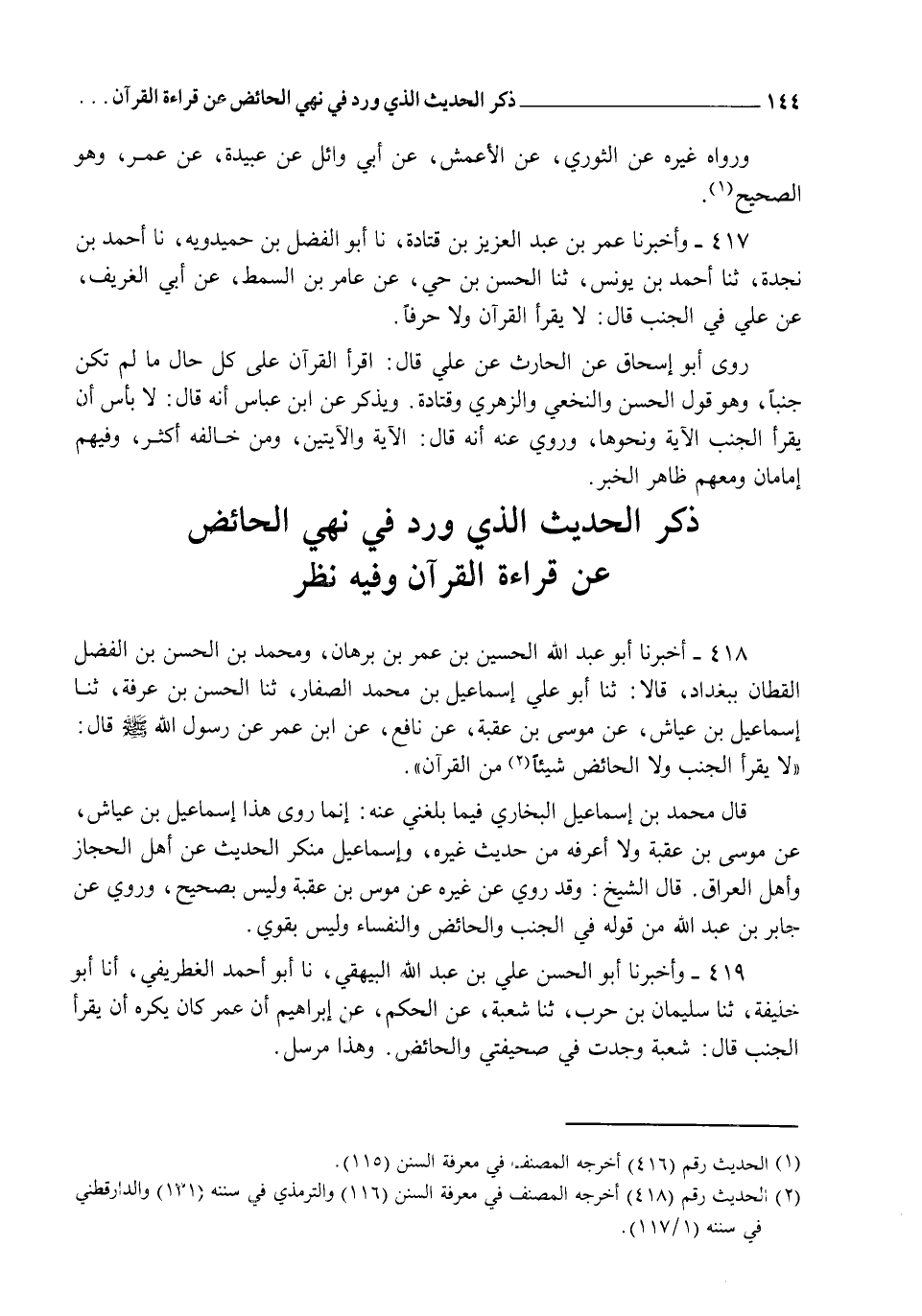 418 - أَخْبَرَنَا أَبُو عَبْدِ اللهِ الْحُسَيْنُ بْنُ عُمَرَ بْنِ بُرْهَانَ، وَمُحَمَّدُ بْنُ الْحَسَنِ بْنِ الْفَضْلِ الْقَطَّانُ بِبَغْدَادَ، قَالَا: ثنا أَبُو عَلِيٍّ إِسْمَاعِيلُ بْنُ مُحَمَّدٍ الصَّفَّارُ، ثنا الْحَسَنُ بْنُ عَرَفَةَ، ثنا إِسْمَاعِيلُ بْنُ عَيَّاشٍ، عَنْ مُوسَى بْنِ عُقْبَةَ، عَنْ نَافِعٍ، عَنِ ابْنِ عُمَرَ، عَنْ رَسُولِ اللهِ صَلَّى اللهُ عَلَيْهِ وَسَلَّمَ قَالَ: §" لَا يَقْرَأُ الْجُنُبُ وَلَا الْحَائِضُ شَيْئًا مِنَ الْقُرْآنِ ". قَالَ مُحَمَّدُ بْنُ إِسْمَاعِيلَ الْبُخَارِيُّ فِيمَا بَلَغَنِي عَنْهُ: إِنَّمَا رَوَى هَذَا إِسْمَاعِيلُ بْنُ عَيَّاشٍ، عَنْ مُوسَى بْنِ عُقْبَةَ وَلَا أَعْرِفُهُ مِنْ حَدِيثٍ غَيْرِهِ، وَإِسْمَاعِيلُ مُنْكَرُ الْحَدِيثِ، عِنْدَ أَهْلِ الْحِجَازِ وَأَهْلِ الْعِرَاقِ. قَالَ الشَّيْخُ: وَقَدْ رُوِيَ عَنْ غَيْرِهِ، عَنْ مُوسَى بْنِ عُقْبَةَ، وَلَيْسَ بِصَحِيحٍ، وَرُوِيَ عَنْ جَابِرِ بْنِ عَبْدِ اللهِ مِنْ قَوْلِهِ فِي الْجُنُبِ وَالْحَائِضِ وَالنُّفَسَاءِ، وَلَيْسَ بِقَوِيٍّ