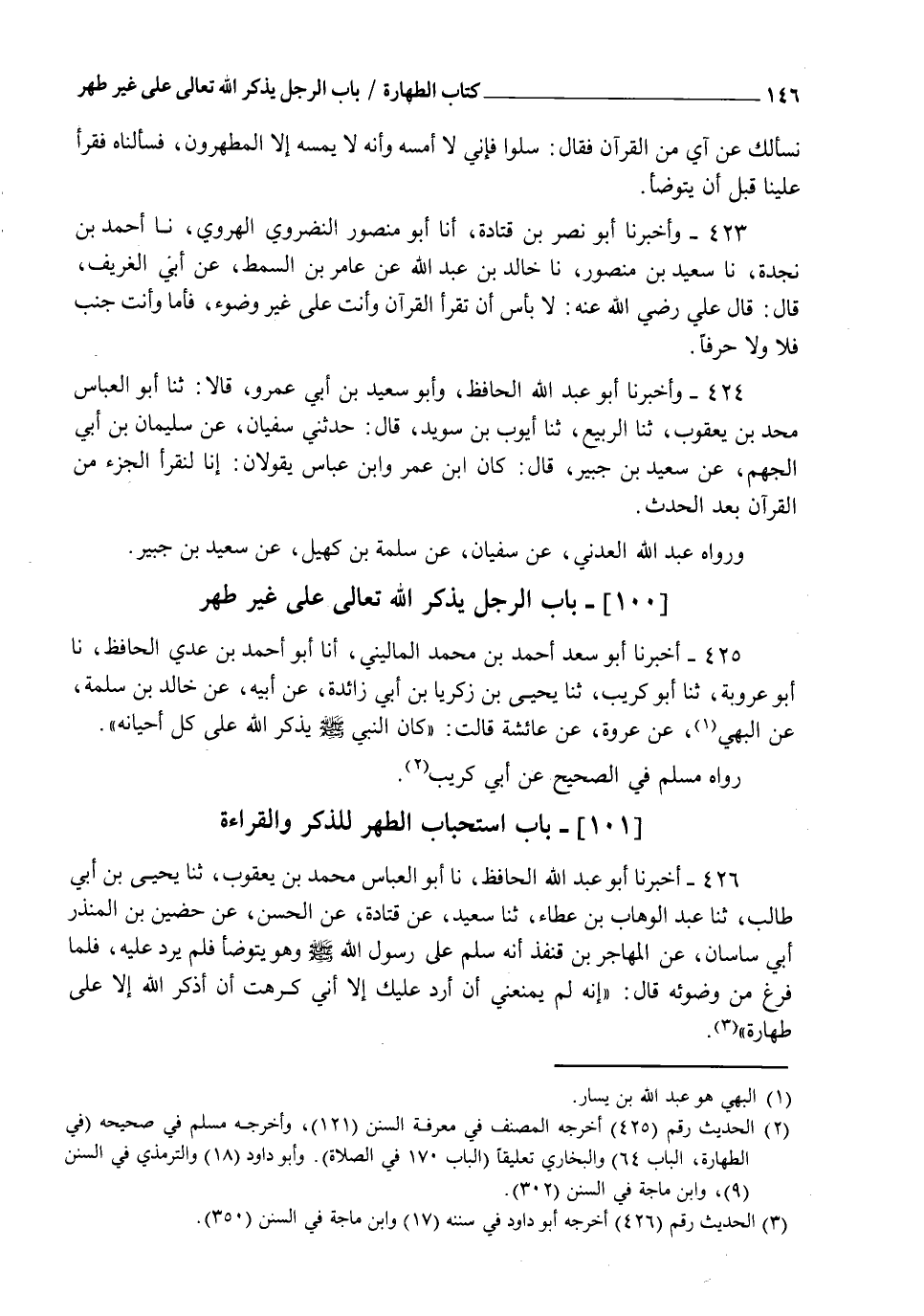 424 - وَأَخْبَرَنَا أَبُو عَبْدِ اللهِ الْحَافِظُ، وَأَبُو سَعِيدِ بْنُ أَبِي عَمْرٍو، قَالَا: ثنا أَبُو الْعَبَّاسِ مُحَمَّدُ بْنُ يَعْقُوبَ، ثنا الرَّبِيعُ، ثنا أَيُّوبُ بْنُ سُوَيْدٍ، قَالَ: حَدَّثَنِي سُفْيَانُ، عَنْ سُلَيْمَانَ بْنِ أَبِي الْجَهْمِ، عَنْ سَعِيدِ بْنِ جُبَيْرٍ، قَالَ: كَانَ ابْنُ عُمَرَ وَابْنُ عَبَّاسٍ، يَقُولَانِ: §" إِنَّا لَنَقْرَأُ الْجُزْءَ مِنَ الْقُرْآنِ بَعْدَ الْحَدَثِ ". وَرَوَاهُ عَبْدُ اللهِ الْعَدَنِيُّ، عَنْ سُفْيَانَ، عَنْ سَلَمَةَ بْنِ كُهَيْلٍ، عَنْ سَعِيدِ بْنِ جُبَيْرٍ "