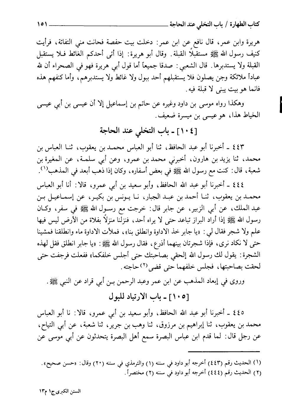 444 - أَخْبَرَنَا أَبُو عَبْدِ اللهِ الْحَافِظُ، وَأَبُو سَعِيدِ بْنُ أَبِي عَمْرٍو، قَالَا: أنا أَبُو الْعَبَّاسِ مُحَمَّدُ بْنُ يَعْقُوبَ، ثنا أَحْمَدُ بْنُ عَبْدِ الْجَبَّارِ، نا يُونُسُ بْنُ بُكَيْرٍ، عَنْ إِسْمَاعِيلَ بْنِ عَبْدِ الْمَلِكِ، عَنْ أَبِي الزُّبَيْرِ، عَنْ جَابِرٍ، قَالَ: خَرَجْتُ مَعَ رَسُولِ اللهِ صَلَّى اللهُ عَلَيْهِ وَسَلَّمَ فِي سَفَرٍ، وَكَانَ رَسُولُ اللهِ صَلَّى اللهُ عَلَيْهِ وَسَلَّمَ إِذَا أَرَادَ الْبَرَازَ تَبَاعَدَ حَتَّى لَا يَرَاهُ أَحَدٌ، فَنَزَلْنَا مَنْزِلًا بِفَلَاةٍ مِنَ الْأَرْضِ لَيْسَ فِيهَا عَلَمٌ وَلَا شَجَرٌ، فَقَالَ لِي: " يَا جَابِرُ، خُذِ الْإِدَاوَةَ وَانْطَلِقْ بِنَا ". فَمَلَأْتُ الْإِدَاوَةَ مَاءً، وَانْطَلَقْنَا، فَمَشَيْنَا حَتَّى لَا نَكَادُ نُرَى، فَإِذَا شَجَرَتَانِ بَيْنَهُمَا أَذْرُعٌ، فَقَالَ رَسُولُ اللهِ صَلَّى اللهُ عَلَيْهِ وَسَلَّمَ: " يَا جَابِرُ، انْطَلِقْ §فَقُلْ لِهَذِهِ الشَّجَرَةِ: يَقُولُ لَكِ رَسُولُ اللهِ: الْحَقِي بِصَاحِبَتِكِ حَتَّى أَجْلِسَ خَلْفَكُمَا " فَفَعَلْتُ، فَرَجَفَتْ حَتَّى لَحِقَتْ بِصَاحِبَتِهَا، فَجَلَسَ خَلْفَهُمَا حَتَّى قَضَى حَاجَتَهُ " وَرُوِيَ فِي إبْعَادِ الْمَذْهَبِ عَنِ ابْنِ عُمَرَ، وَعَبْدِ الرَّحْمَنِ بْنِ أَبِي قُرَادٍ، عَنِ النَّبِيِّ صَلَّى اللهُ عَلَيْهِ وَسَلَّمَ
