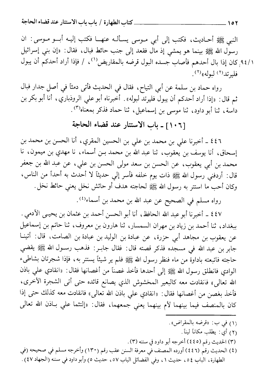 446 - أَخْبَرَنَا عَلِيُّ بْنُ مُحَمَّدِ بْنِ عَلِيِّ بْنِ الْحُسَيْنِ الْمُقْرِئُ، أنا الْحَسَنُ بْنُ مُحَمَّدِ بْنِ إِسْحَاقَ، أنا يُوسُفُ بْنُ يَعْقُوبَ، ثنا عَبْدُ اللهِ بْنُ مُحَمَّدِ بْنِ أَسْمَاءَ، نا مَهْدِيُّ بْنُ مَيْمُونٍ، نا مُحَمَّدُ بْنُ أَبِي يَعْقُوبَ، عَنِ الْحَسَنِ بْنِ سَعْدٍ مَوْلَى الْحَسَنِ بْنِ عَلِيٍّ، عَنْ عَبْدِ اللهِ بْنِ جَعْفَرٍ، قَالَ: " أَرْدَفَنِي رَسُولُ اللهِ صَلَّى اللهُ عَلَيْهِ وَسَلَّمَ ذَاتَ يَوْمٍ خَلْفَهُ، فَأَسَرَّ إِلَيَّ حَدِيثًا لَا أُحَدِّثُ بِهِ أَحَدًا مِنَ النَّاسِ، وَكَانَ §أَحَبَّ مَا اسْتَتَرَ بِهِ رَسُولُ اللهِ صَلَّى اللهُ عَلَيْهِ وَسَلَّمَ لِحَاجَتِهِ هَدَفٌ أَوْ حَائِشُ نَخْلٍ " يَعْنِي حَائِطَ نَخْلٍ. رَوَاهُ مُسْلِمٌ فِي الصَّحِيحِ عَنْ عَبْدِ اللهِ بْنِ مُحَمَّدِ بْنِ أَسْمَاءَ
