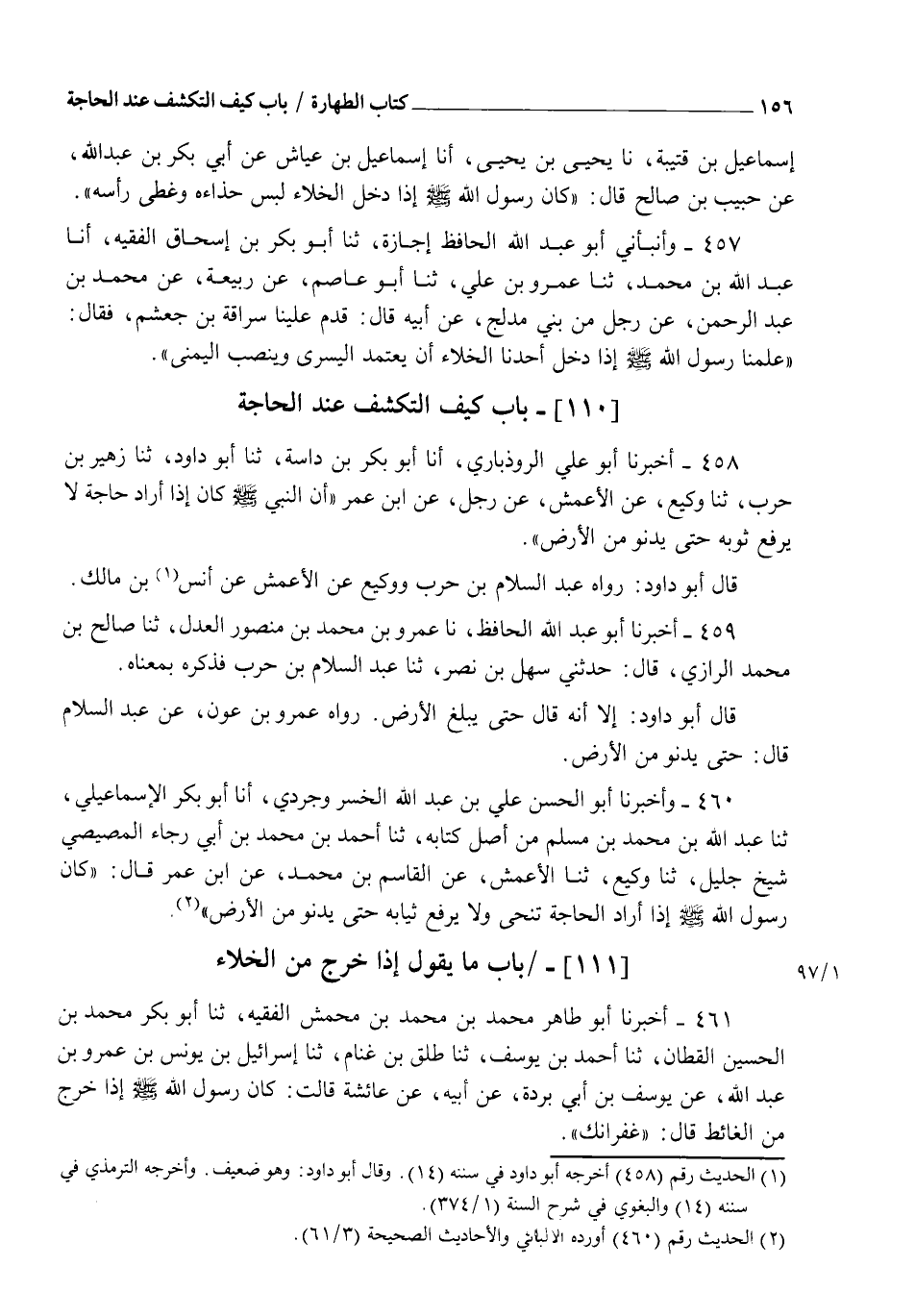 458 - أَخْبَرَنَا أَبُو عَلِيٍّ الرُّوذْبَارِيُّ، أنا أَبُو بَكْرِ بْنُ دَاسَةَ، ثنا أَبُو دَاودَ، ثنا زُهَيْرُ بْنُ حَرْبٍ، ثنا وَكِيعٌ، عَنِ الْأَعْمَشِ، عَنْ رَجُلٍ، عَنِ ابْنِ عُمَرَ، أَنَّ النَّبِيَّ صَلَّى اللهُ عَلَيْهِ وَسَلَّمَ كَانَ §" إِذَا أَرَادَ حَاجَةً لَا يَرْفَعُ ثَوْبَهُ حَتَّى يَدْنُوَ مِنَ الْأَرْضِ ". قَالَ أَبُو دَاودَ: رَوَاهُ عَبْدُ السَّلَامِ بْنُ حَرْبٍ، وَوَكِيعٌ، عَنِ الْأَعْمَشِ، عَنْ أَنَسِ بْنِ مَالِكٍ