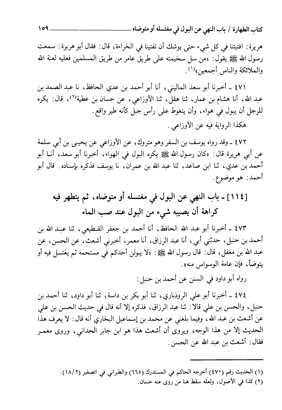 473 - أَخْبَرَنَا أَبُو عَبْدِ اللهِ الْحَافِظُ، أنا أَحْمَدُ بْنُ جَعْفَرٍ الْقَطِيعِيُّ، ثنا عَبْدُ اللهِ بْنُ أَحْمَدَ بْنِ حَنْبَلٍ، حَدَّثَنِي أَبِي، أنا عَبْدُ الرَّزَّاقِ، أنا مَعْمَرٌ، أَخْبَرَنِي أَشْعَثُ، عَنِ الْحَسَنِ، عَنْ عَبْدِ اللهِ بْنِ مُغَفَّلٍ، قَالَ: قَالَ رَسُولُ اللهِ صَلَّى اللهُ عَلَيْهِ وَسَلَّمَ: " §لَا يَبُولَنَّ أَحَدُكُمْ فِي مُسْتَحَمِّهِ، ثُمَّ يَغْتَسِلُ فِيهِ أَوْ يَتَوَضَّأُ، فَإِنَّ عَامَّةَ الْوَسْوَاسِ مِنْهُ ". رَوَاهُ أَبُو دَاودَ فِي السُّنَنِ، عَنْ أَحْمَدَ بْنِ حَنْبَلٍ.