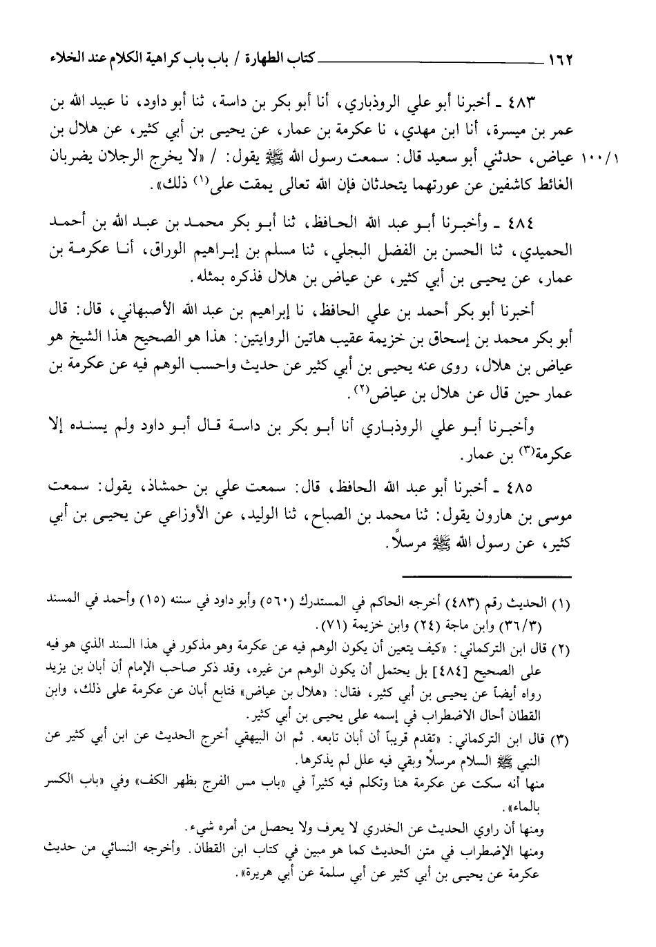 484 - وَأَخْبَرَنَا أَبُو عَبْدِ اللهِ الْحَافِظُ، ثنا أَبُو بَكْرٍ مُحَمَّدُ بْنُ عَبْدِ اللهِ بْنِ أَحْمَدَ الْحُمَيْدِيُّ، ثنا الْحَسَنُ بْنُ الْفَضْلِ الْبَجَلِيُّ، ثنا مُسْلِمُ بْنُ إِبْرَاهِيمَ الْوَرَّاقُ، أنا عِكْرِمَةُ بْنُ عَمَّارٍ، عَنْ يَحْيَى بْنِ أَبِي كَثِيرٍ، عَنْ عِيَاضِ بْنِ هِلَالٍ، فَذَكَرَهُ بِمِثْلِهِ. أَخْبَرَنَا أَبُو بَكْرٍ أَحْمَدُ بْنُ عَلِيٍّ الْحَافِظُ، نا إِبْرَاهِيمُ بْنُ عَبْدِ اللهِ الْأَصْبَهَانِيُّ، قَالَ: قَالَ أَبُو بَكْرٍ مُحَمَّدُ بْنُ إِسْحَاقَ بْنِ خُزَيْمَةَ عَقِيبَ هَاتَيْنِ الرِّوَايَتَيْنِ: هَذَا هُوَ الصَّحِيحُ، هَذَا الشَّيْخُ هُوَ عِيَاضُ بْنُ هِلَالٍ، رَوَى عَنْهُ يَحْيَى بْنُ أَبِي كَثِيرٍ غَيْرَ حَدِيثٍ، وَأَحْسَبُ الْوَهْمَ فِيهِ عَنْ عِكْرِمَةَ بْنِ عَمَّارٍ حِينَ قَالَ: عَنْ هِلَالِ بْنِ عِيَاضٍ، وَأَخْبَرَنَا أَبُو عَلِيٍّ الرُّوذْبَارِيُّ، أَنَا أَبُو بَكْرِ بْنُ دَاسَةَ قَالَ: قَالَ أَبُو دَاوُدَ: وَلَمْ يُسْنِدْهُ إِلَّا عِكْرِمَةُ بْنُ عَمَّارٍ