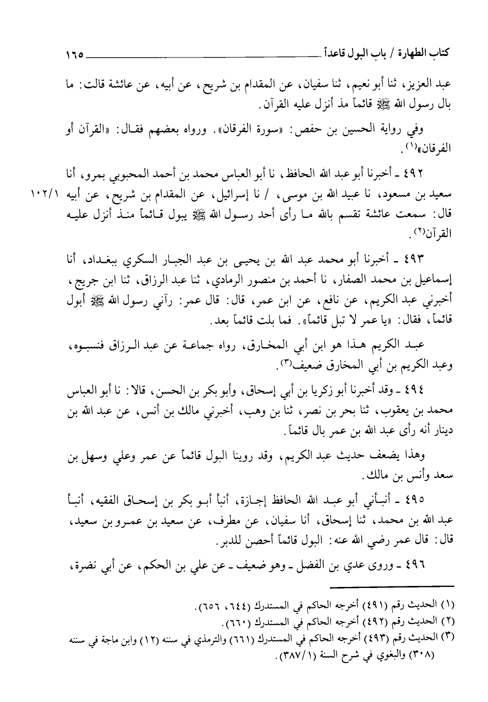 492 - أَخْبَرَنَا أَبُو عَبْدِ اللهِ الْحَافِظُ، نا أَبُو الْعَبَّاسِ مُحَمَّدُ بْنُ أَحْمَدَ الْمَحْبُوبِيُّ بِمَرْوَ، أنا سَعِيدُ بْنُ مَسْعُودٍ، نا عُبَيْدُ اللهِ بْنُ مُوسَى، نا إِسْرَائِيلُ، عَنِ الْمِقْدَامِ بْنِ شُرَيْحٍ، عَنْ أَبِيهِ، قَالَ: سَمِعْتُ عَائِشَةَ " تُقْسِمُ بِاللهِ §مَا رَأَى أَحَدٌ رَسُولَ اللهِ صَلَّى الله عَلَيْهِ وَسَلَمْ يَبُولُ قَائِمًا مُنْذُ أُنْزِلَ عَلَيْهِ الْقُرْآنُ "