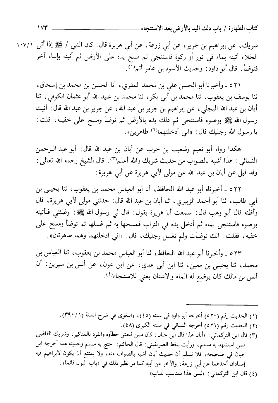 521 - وَأَخْبَرَنَا أَبُو الْحَسَنِ عَلِيُّ بْنُ مُحَمَّدٍ الْمُقْرِئُ، أنا الْحَسَنُ بْنُ مُحَمَّدِ بْنِ إِسْحَاقَ، ثنا يُوسُفُ بْنُ يَعْقُوبَ، ثنا مُحَمَّدُ بْنُ أَبِي بَكْرٍ، ثنا مُحَمَّدُ بْنُ عُبَيْدِ اللهِ أَبُو عُثْمَانَ الْكُوفِيُّ، ثنا أَبَانُ بْنُ عَبْدِ اللهِ الْبَجَلِيُّ، عَنْ إِبْرَاهِيمَ بْنِ جَرِيرِ بْنِ عَبْدِ اللهِ، عَنْ جَرِيرِ بْنِ عَبْدِ اللهِ، قَالَ: أَتَيْتُ رَسُولَ اللهِ صَلَّى اللهُ عَلَيْهِ وَسَلَّمَ بِوَضُوءٍ فَاسْتَنْجَى، ثُمَّ دَلَكَ يَدَهُ بِالْأَرْضِ، ثُمَّ تَوَضَّأَ وَمَسَحَ عَلَى خُفَّيْهِ. قُلْتُ: يَا رَسُولَ اللهِ، رِجْلَيْكَ قَالَ: " §إِنِّي أَدْخَلْتُهُمَا طَاهِرَينِ ". هَكَذَا رَوَاهُ أَبُو نُعَيْمٍ، وَشُعَيْبُ بْنُ حَرْبٍ، عَنْ أَبَانَ بْنِ عَبْدِ اللهِ. قَالَ أَبُو عَبْدِ الرَّحْمَنِ النَّسَائِيُّ: هَذَا أَشْبَهُ بِالصَّوَابِ مِنْ حَدِيثِ شَرِيكٍ، وَاللهُ أَعْلَمُ. قَالَ الشَّيْخُ رَحِمَهُ اللهُ تَعَالَى: وَقَدْ قِيلَ عَنْ أَبَانَ بْنِ عَبْدِ اللهِ، عَنْ مَوْلًى لِأَبِي هُرَيْرَةَ، عَنْ أَبِي هُرَيْرَةَ