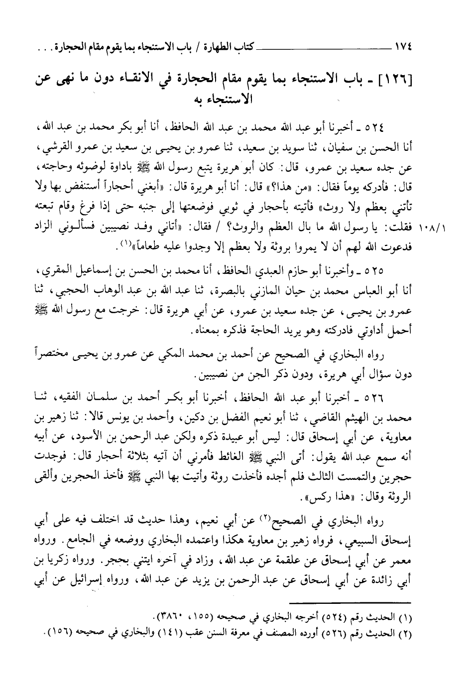 526 - أَخْبَرَنَا أَبُو عَبْدِ اللهِ الْحَافِظُ، أَخْبَرَنَا أَبُو بَكْرٍ أَحْمَدُ بْنُ سَلْمَانَ الْفَقِيهُ، ثنا مُحَمَّدُ بْنُ الْهَيْثَمِ الْقَاضِي، ثنا أَبُو نُعَيْمٍ الْفَضْلُ بْنُ دُكَيْنٍ، وَأَحْمَدُ بْنُ يُونُسَ، قَالَا: ثنا زُهَيْرُ بْنُ مُعَاوِيَةَ، عَنْ أَبِي إِسْحَاقَ، قَالَ: لَيْسَ أَبُو عُبَيْدَةَ ذَكَرَهُ، وَلَكِنَّ عَبْدَ الرَّحْمَنِ بْنَ الْأَسْوَدِ، عَنْ أَبِيهِ، أَنَّهُ سَمِعَ عَبْدَ اللهِ، يَقُولُ: أَتَى النَّبِيُّ صَلَّى الله عَلَيْهِ وَسَلِمَ الْغَائِطَ، فَأَمَرَنِي أَنْ آتِيَهُ بِثَلَاثَةِ أَحْجَارٍ. قَالَ: فَوَجَدْتُ حَجَرَيْنِ، وَالْتَمَسْتُ الثَّالِثَ، فَلَمْ أَجِدْهُ، فَأَخَذْتُ رَوْثَةً وَأَتَيْتُ بِهَا النَّبِيَّ صَلَّى اللهُ عَلَيْهِ وَسَلَّمَ، فَأَخَذَ الْحَجَرَيْنِ، وَأَلْقَى الرَّوْثَةَ، وَقَالَ: §" هَذَا رِكْسٌ ". رَوَاهُ الْبُخَارِيُّ فِي الصَّحِيحِ عَنْ أَبِي نُعَيْمٍ، وَهَذَا حَدِيثٌ قَدِ اخْتُلِفَ فِيهِ عَلَى أَبِي إِسْحَاقَ السَّبِيعِيِّ، فَرَوَاهُ زُهَيْرُ بْنُ مُعَاوِيَةَ هَكَذَا، وَاعْتَمَدَهُ الْبُخَارِيُّ وَوَضَعَهُ فِي الْجَامِعِ، وَرَوَاهُ مَعْمَرٌ، عَنْ أَبِي إِسْحَاقَ، عَنْ عَلْقَمَةَ، عَنْ عَبْدِ اللهِ، وَزَادَ فِي آخِرِهِ: " ايْتِنِي بِحَجَرٍ ". وَرَوَاهُ زَكَرِيَّا بْنُ أَبِي زَائِدَةَ، عَنْ أَبِي إِسْحَاقَ، عَنْ عَبْدِ الرَّحْمَنِ بْنِ يَزِيدَ، عَنْ عَبْدِ اللهِ، وَرَوَاهُ إِسْرَائِيلُ، عَنْ أَبِي -[175]- إِسْحَاقَ، عَنْ أَبِي عُبَيْدَةَ، عَنْ عَبْدِ اللهِ. قَالَ أَبُو عِيسَى التِّرْمِذِيُّ: حَدِيثُ إِسْرَائِيلَ عِنْدِي أَثْبَتُ وَأَصَحُّ لِأَنَّ إِسْرَائِيلَ أَثْبَتُ فِي أَبِي إِسْحَاقَ مِنْ هَؤُلَاءِ، وَتَابَعَهُ عَلَى ذَلِكَ قَيْسُ بْنُ الرَّبِيعِ، وَقَالَ: وَزُهَيْرٌ فِي أَبِي إِسْحَاقَ لَيْسَ بِذَلِكَ لِأَنَّ سَمَاعَهُ عَنْ أَبِي إِسْحَاقَ فِي آخِرِهِ، وَأَبُو إِسْحَاقَ فِي آخِرِ أَمْرِهِ كَانَ قَدْ سَاءَ حِفْظُهُ