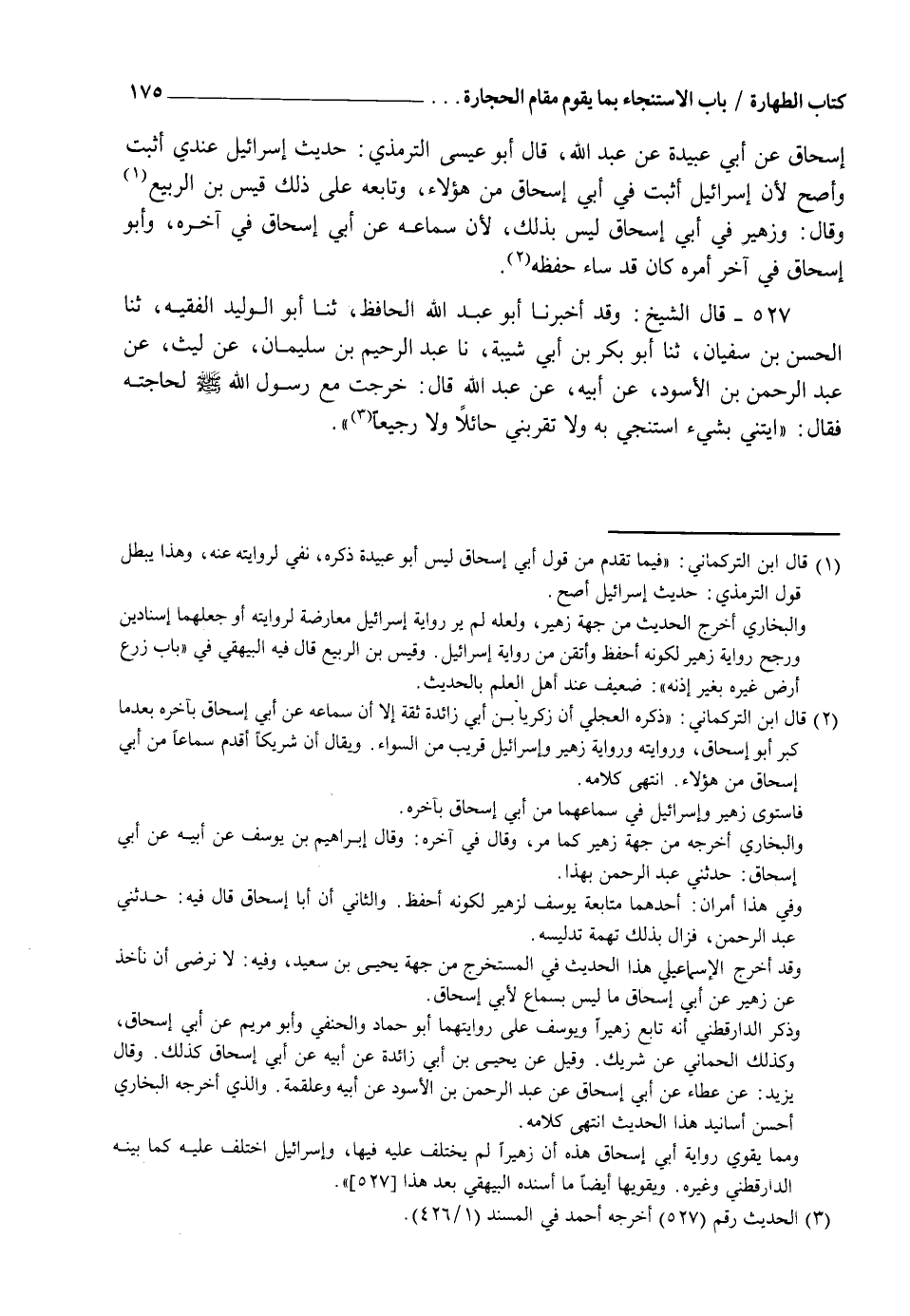 527 - قَالَ الشَّيْخُ: وَقَدْ أَخْبَرَنَا أَبُو عَبْدِ اللهِ الْحَافِظُ، ثنا أَبُو الْوَلِيدِ الْفَقِيهُ، ثنا الْحَسَنُ بْنُ سُفْيَانَ، ثنا أَبُو بَكْرِ بْنُ أَبِي شَيْبَةَ، نا عَبْدُ الرَّحِيمِ بْنِ سُلَيْمَانَ، عَنْ لَيْثٍ، عَنْ عَبْدِ الرَّحْمَنِ بْنِ الْأَسْوَدِ، عَنْ أَبِيهِ، عَنْ عَبْدِ اللهِ، قَالَ: خَرَجْتُ مَعَ رَسُولِ اللهِ صَلَّى اللهُ عَلَيْهِ وَسَلَّمَ لِحَاجَتِهِ فَقَالَ: " §ايتِنِي بِشَيْءٍ أَسْتَنْجِي بِهِ، وَلَا تُقَرِّبْنِي حَائِلًا وَلَا رَجِيعًا ". -[176]- وَهَذِهِ الرِّوَايَةُ إِنْ صَحَّتْ تُقَوِّي رِوَايَةَ أَبِي إِسْحَاقَ، عَنْ عَبْدِ الرَّحْمَنِ بْنِ الْأَسْوَدِ، إِلَّا أَنَّ لَيْثَ بْنَ أَبِي سُلَيْمٍ ضَعِيفٌ