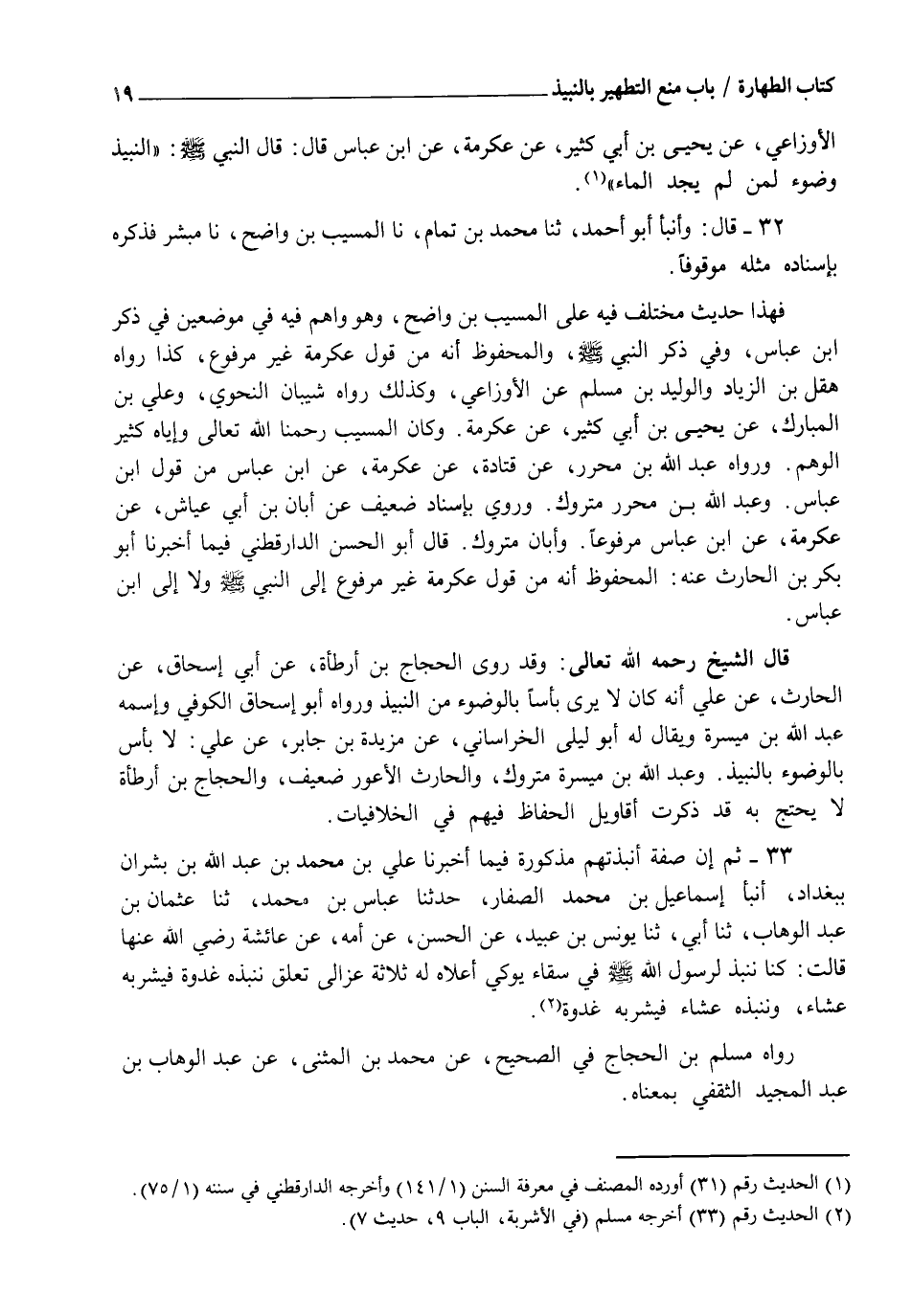 33 - ثُمَّ إِنَّ صِفَةَ أَنْبِذَتِهِمْ مَذْكُورَةٌ فِيمَا، أَخْبَرَنَا عَلِيُّ بْنُ مُحَمَّدِ بْنِ عَبْدِ اللهِ بْنِ بِشْرَانَ بِبَغْدَادَ، أنبأ إِسْمَاعِيلُ بْنُ مُحَمَّدٍ الصَّفَّارُ، حَدَّثَنَا عَبَّاسُ بْنُ مُحَمَّدٍ، ثنا عُثْمَانُ بْنُ عَبْدِ الْوَهَّابِ، ثنا أَبِي، ثنا يُونُسُ بْنُ عُبَيْدٍ، عَنِ الْحَسَنِ، عَنْ أُمِّهِ، عَنْ عَائِشَةَ رَضِيَ اللهُ عَنْهَا، قَالَتْ: " كُنَّا §نَنْبِذُ لِرَسُولِ اللهِ صَلَّى اللهُ عَلَيْهِ وَسَلَّمَ فِي سِقَاءٍ يُوكَى أَعْلَاهُ لَهُ ثَلَاثَةُ عَزَالِي تُعَلَّقُ نَنْبِذُهُ غُدْوَةً فَيَشْرَبُهُ عِشَاءً، وَنَنْبِذُهُ عِشَاءً فَيَشْرَبُهُ غُدْوَةً ". رَوَاهُ مُسْلِمُ بْنُ الْحَجَّاجِ فِي الصَّحِيحِ، عَنْ مُحَمَّدِ بْنِ الْمُثَنَّى، عَنْ عَبْدِ الْوَهَّابِ بْنِ عَبْدِ الْمَجِيدِ الثَّقَفِيِّ بِمَعْنَاهُ