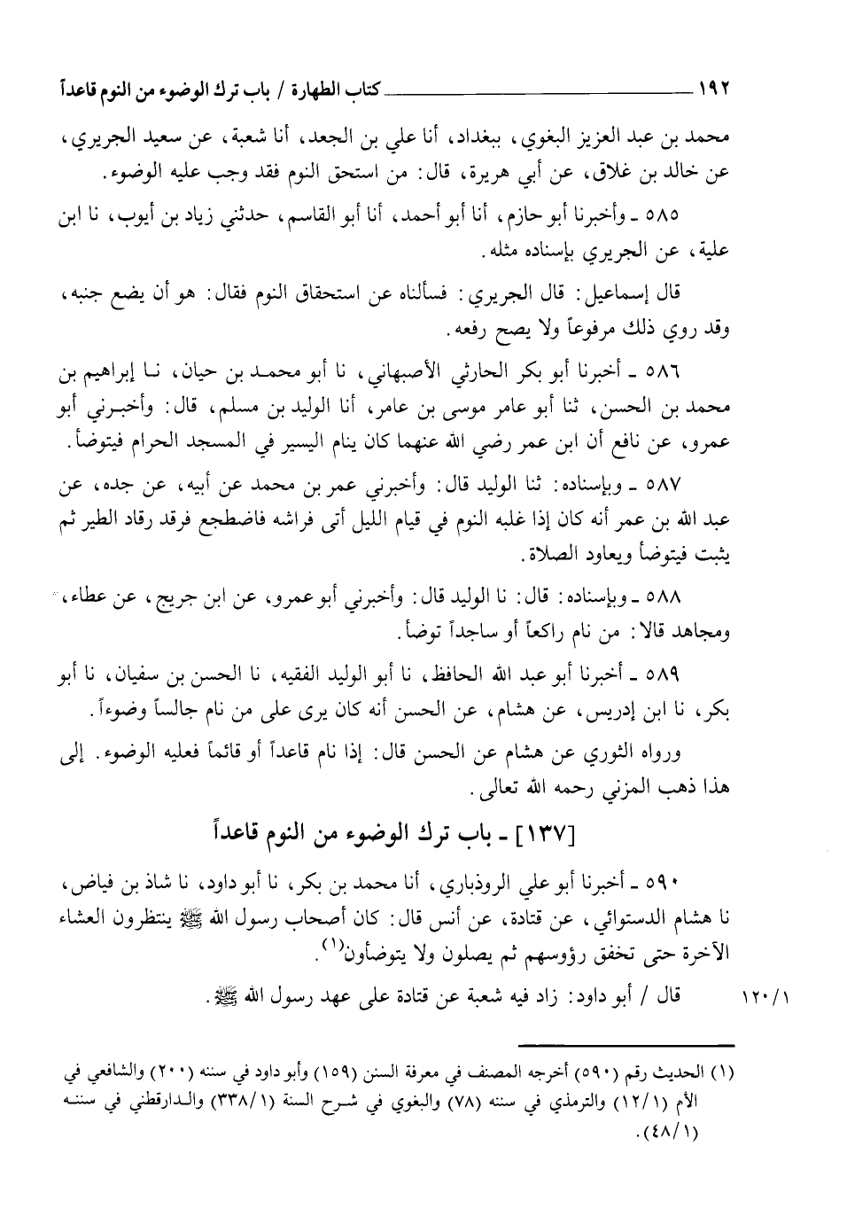 590 - أَخْبَرَنَا أَبُو عَلِيٍّ الرُّوذْبَارِيُّ، أنا مُحَمَّدُ بْنُ بَكْرٍ، نا أَبُو دَاودَ، نا شَاذُّ بْنُ فَيَّاضٍ، نا هِشَامٌ الدَّسْتُوَائِيُّ، عَنْ قَتَادَةَ، عَنْ أَنَسٍ، قَالَ: " كَانَ أَصْحَابُ رَسُولِ اللهِ صَلَّى الله عَلَيْهِ وَسَلَمْ، §ينْتَظِرُونَ الْعِشَاءَ الْآخِرَةَ حَتَّى تَخْفِقَ رُءُوسُهُمْ، ثُمَّ يُصَلُّونَ وَلَا يَتَوَضَّئُونَ " قَالَ أَبُو دَاودَ: زَادَ فِيهِ شُعْبَةُ، عَنْ قَتَادَةَ: عَلَى عَهْدِ رَسُولِ اللهِ صَلَّى اللهُ عَلَيْهِ وَسَلَّمَ