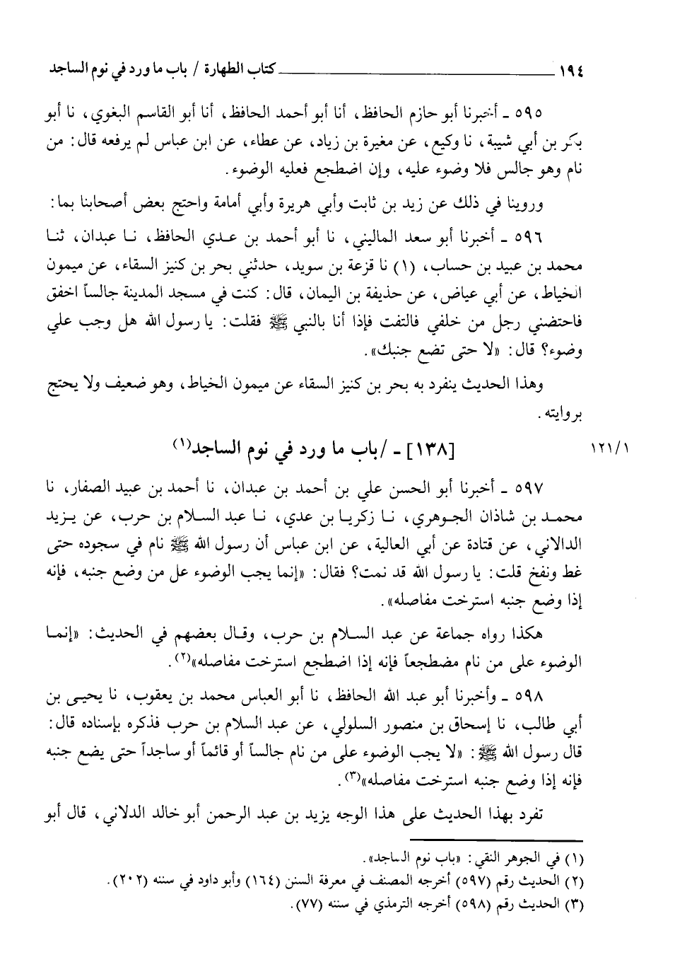 597 - أَخْبَرَنَا أَبُو الْحَسَنِ عَلِيُّ بْنُ أَحْمَدَ بْنِ عَبْدَانَ، نا أَحْمَدُ بْنُ عُبَيْدٍ الصَّفَّارُ، نا مُحَمَّدُ بْنُ شَاذَانَ الْجَوْهَرِيُّ، نا زَكَرِيَّا بْنُ عَدِيٍّ، نا عَبْدُ السَّلَامِ بْنُ حَرْبٍ، عَنْ يَزِيدَ الدَّالَانِيِّ، عَنْ قَتَادَةَ، عَنْ أَبِي الْعَالِيَةِ، عَنِ ابْنِ عَبَّاسٍ، أَنَّ رَسُولَ اللهِ صَلَّى اللهُ عَلَيْهِ وَسَلَّمَ نَامَ فِي سُجُودِهِ حَتَّى غَطَّ وَنَفَخَ، قُلْتُ: يَا رَسُولَ اللهِ، قَدْ نِمْتَ؟ فَقَالَ: " §إِنَّمَا يَجِبُ الْوُضُوءُ عَلَى مَنْ وَضَعَ جَنْبَهُ، فَإِنَّهُ إِذَا وَضَعَ جَنْبَهُ اسْتَرْخَتْ مَفَاصِلُهُ ". هَكَذَا رَوَاهُ جَمَاعَةٌ، عَنْ عَبْدِ السَّلَامِ بْنِ حَرْبٍ. وَقَالَ بَعْضُهُمْ فِي الْحَدِيثِ: " إِنَّمَا الْوضُوءُ عَلَى مَنْ نَامَ مُضْطَجِعًا، فَإِنَّهُ إِذَا اضْطَجَعَ اسْتَرْخَتْ مَفَاصِلُهُ "