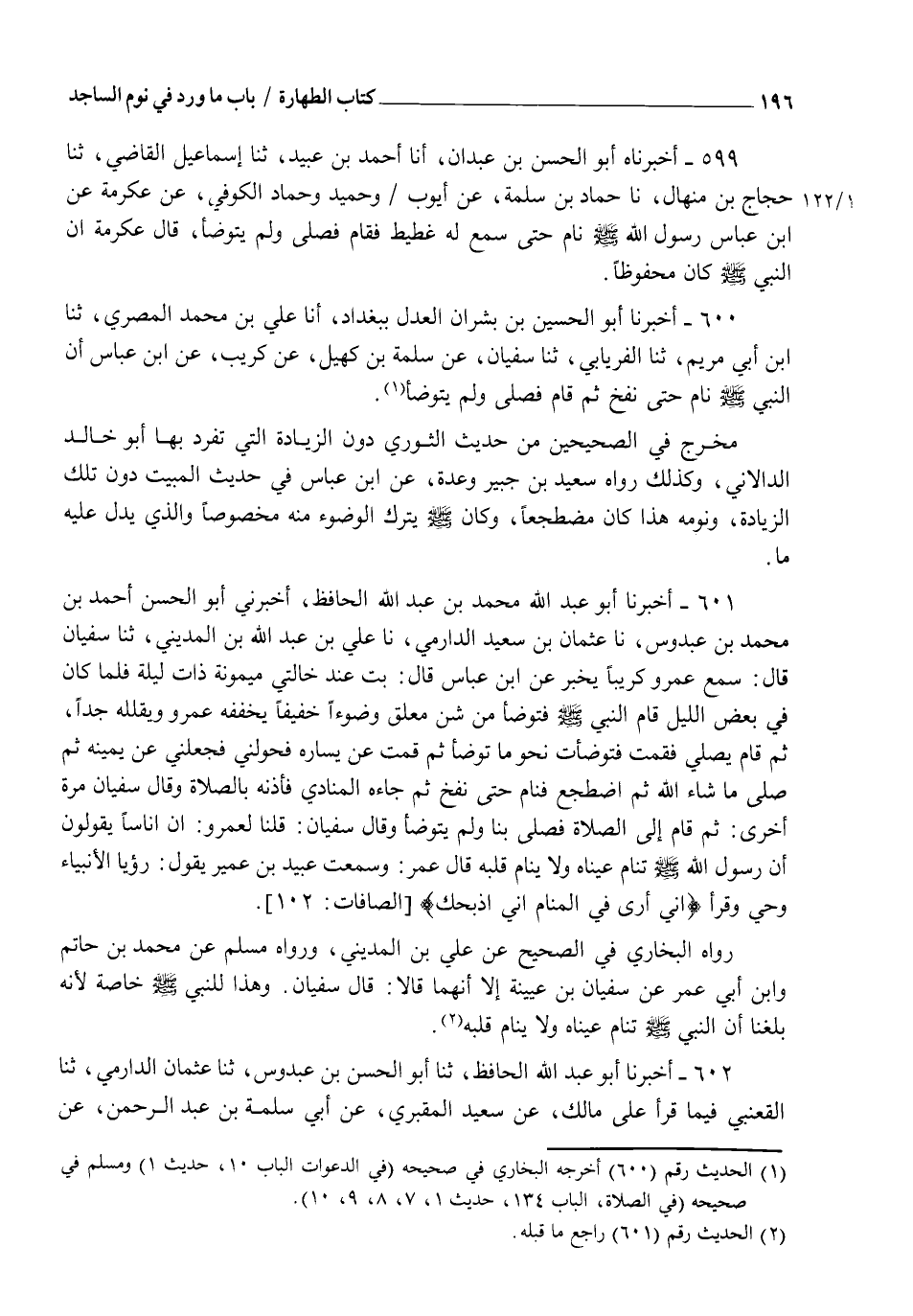 600 - أَخْبَرَنَا أَبُو الْحُسَيْنِ بْنُ بِشْرَانَ الْعَدْلُ بِبَغْدَادَ، أنا عَلِيُّ بْنُ مُحَمَّدٍ الْمِصْرِيُّ، ثنا ابْنُ أَبِي مَرْيَمَ، ثنا الْفِرْيَابِيُّ، ثنا سُفْيَانُ، عَنْ سَلَمَةَ بْنِ كُهَيْلٍ، عَنْ كُرَيْبٍ، عَنِ ابْنِ عَبَّاسٍ " أَنَّ النَّبِيَّ صَلَّى اللهُ عَلَيْهِ وَسَلَّمَ §نَامَ حَتَّى نَفَخَ، ثُمَّ قَامَ فَصَلَّى وَلَمْ يتَوَضَّأْ ". مُخَرَّجٌ فِي الصَّحِيحَيْنِ مِنْ حَدِيثِ الثَّوْرِيِّ دُونَ الزِّيَادَةِ الَّتِي تَفَرَّدَ بِهَا أَبُو خَالِدٍ الدَّالَانِيُّ. وَكَذَلِكَ رَوَاهُ سَعِيدُ بْنُ جُبَيْرٍ وَعِدَّةٌ عَنِ ابْنِ عَبَّاسٍ فِي حَدِيثِ الْمَبِيتِ دُونَ تِلْكَ الزِّيَادَةِ، وَنَوْمُهُ هَذَا كَانَ مُضْطَجِعًا، وَكَانَ صَلَّى الله عَلَيْهِ وَسَلَمْ يَتْرُكُ الْوضُوءَ مِنْهُ مَخْصُوصًا