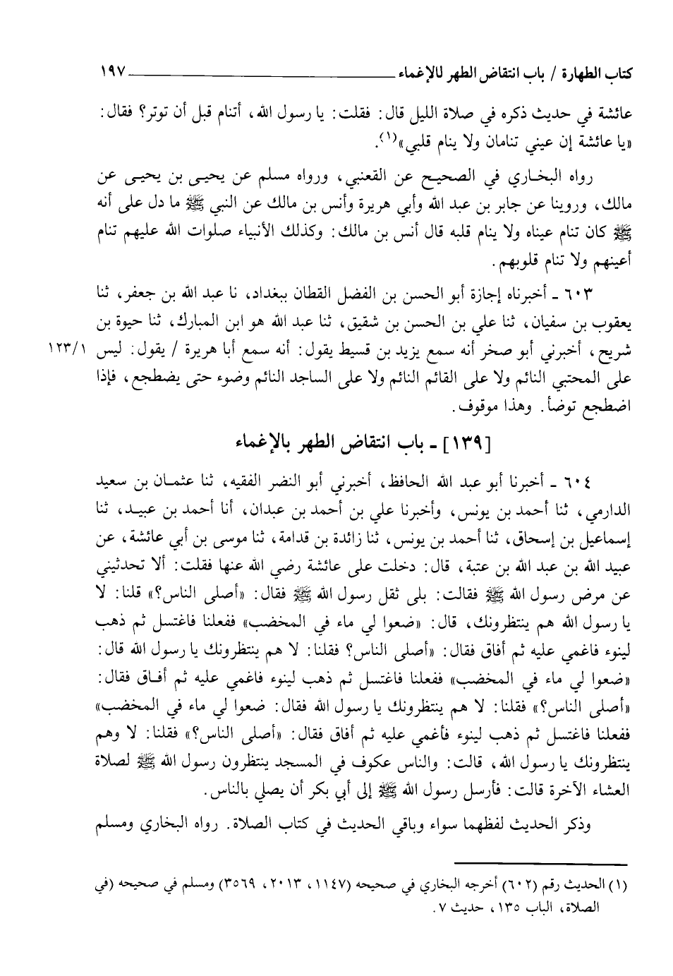 603 - أَخْبَرَنَاهُ إِجَازَةً أَبُو الْحُسَيْنِ بْنُ الْفَضْلِ الْقَطَّانُ بِبَغْدَادَ، نا عَبْدُ اللهِ بْنُ جَعْفَرٍ، ثنا يَعْقُوبُ بْنُ سُفْيَانَ، ثنا عَلِيُّ بْنُ الْحَسَنِ بْنِ شَقِيقٍ، ثنا عَبْدُ اللهِ هُوَ ابْنُ الْمُبَارَكِ، ثنا حَيْوَةُ بْنُ شُرَيْحٍ، أَخْبَرَنِي أَبُو صَخْرٍ أَنَّهُ سَمِعَ يَزِيدَ بْنِ قُسَيْطٍ، يَقُولُ: إِنَّهُ سَمِعَ أَبَا هُرَيْرَةَ، يَقُولُ: §" لَيْسَ عَلَى الْمُحْتَبِي النَّائِمِ وَلَا عَلَى الْقَائِمِ النَّائِمِ وَلَا عَلَى السَّاجِدِ النَّائِمِ وُضُوءٌ، حَتَّى يَضْطَجِعَ، فَإِذَا اضْطَجَعَ تَوَضَّأَ " وَهَذَا مَوْقُوفٌ