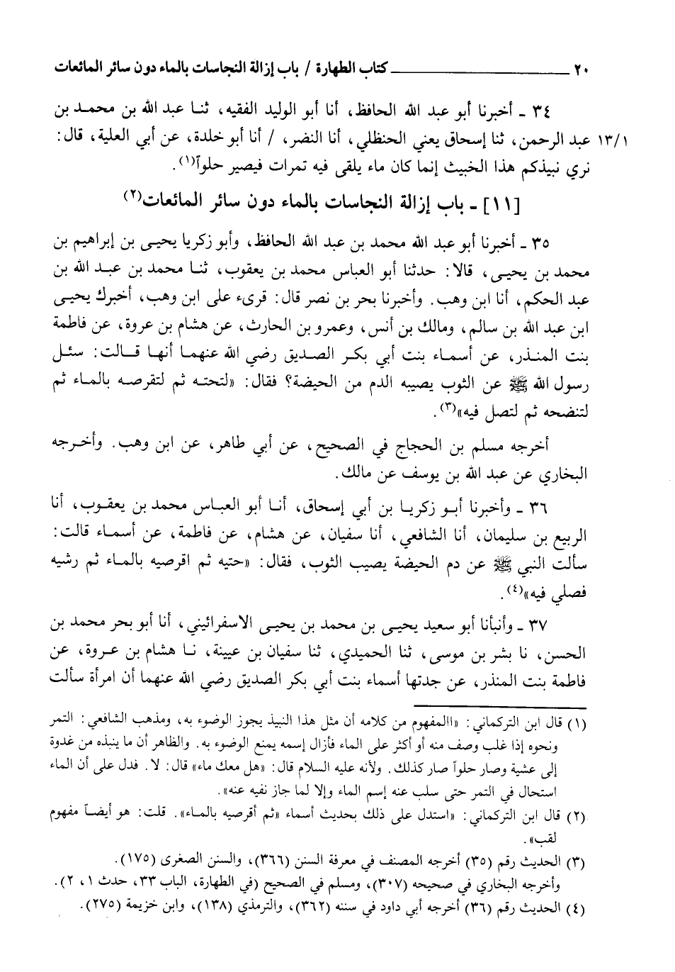 35 - أَخْبَرَنَا أَبُو عَبْدِ اللهِ مُحَمَّدُ بْنُ عَبْدِ اللهِ الْحَافِظُ، وَأَبُو زَكَرِيَّا يَحْيَى بْنُ إِبْرَاهِيمَ بْنِ مُحَمَّدِ بْنِ يَحْيَى، قَالَا: حَدَّثَنَا أَبُو الْعَبَّاسِ مُحَمَّدُ بْنُ يَعْقُوبَ، ثنا مُحَمَّدُ بْنُ عَبْدِ اللهِ بْنِ عَبْدِ الْحَكَمِ، أنا ابْنُ وَهْبٍ، وَأَخْبَرَنَا بَحْرُ بْنُ نَصْرٍ، قَالَ: قُرِئَ عَلَى ابْنِ وَهْبٍ: أَخْبَرَكَ يَحْيَى بْنُ عَبْدِ اللهِ بْنِ سَالِمٍ، وَمَالِكُ بْنُ أَنَسٍ، وَعَمْرُو بْنُ الْحَارِثِ، عَنْ هِشَامِ بْنِ عُرْوَةَ، عَنْ فَاطِمَةَ بِنْتِ الْمُنْذِرِ، عَنْ أَسْمَاءَ بِنْتِ أَبِي بَكْرٍ الصِّدِّيقِ رَضِيَ اللهُ عَنْهَمَا، أَنَّهَا قَالَتْ: سُئِلَ رَسُولُ اللهِ صَلَّى اللهُ عَلَيْهِ وَسَلَّمَ عَنِ الثَّوْبِ يُصِيبُهُ الدَّمُ مِنَ الْحَيْضَةِ فَقَالَ: " §لِتَحُتَّهُ، ثُمَّ لِتَقْرُصْهُ بِالْمَاءِ، ثُمَّ لِتَنْضَحْهُ، ثُمَّ لِتُصَلِّ فِيهِ ". أَخْرَجَهُ مُسْلِمُ بْنُ الْحَجَّاجِ فِي الصَّحِيحِ، عَنْ أَبِي طَاهِرٍ، عَنِ ابْنِ وَهْبٍ، وَأَخْرَجَهُ الْبُخَارِيُّ، عَنْ عَبْدِ اللهِ بْنِ يُوسُفَ، عَنْ مَالِكٍ