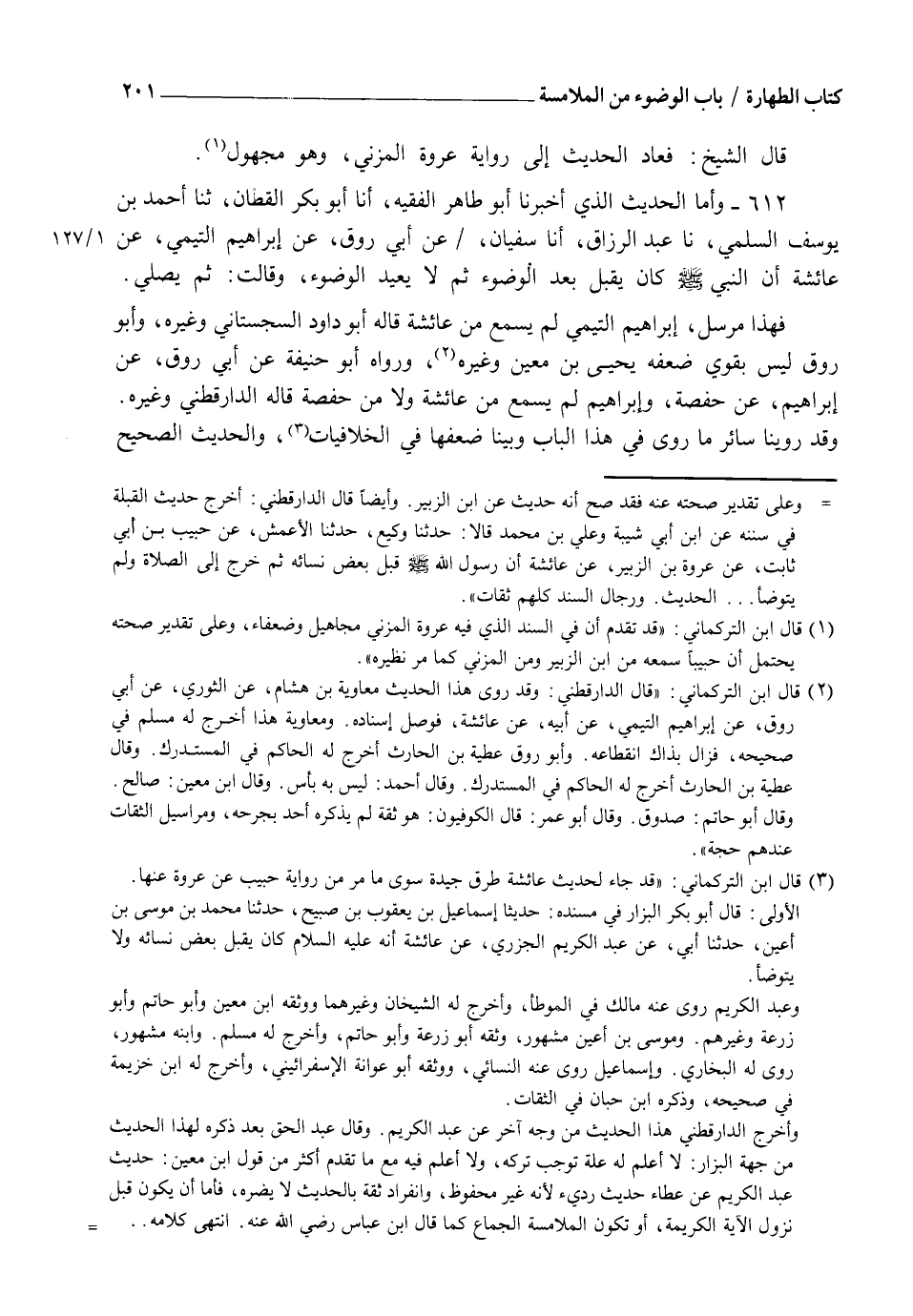 612 - وَأَمَّا الْحَدِيثُ الَّذِي أَخْبَرَنَا أَبُو طَاهِرٍ الْفَقِيهُ، أنا أَبُو بَكْرٍ الْقَطَّانُ، ثنا أَحْمَدُ بْنُ يُوسُفَ السُّلَمِيُّ، نا عَبْدُ الرَّزَّاقِ، أنا سُفْيَانُ، عَنْ أَبِي رَوْقٍ، عَنْ إِبْرَاهِيمَ التَّيْمِيِّ، عَنْ عَائِشَةَ " أَنَّ النَّبِيَّ صَلَّى اللهُ عَلَيْهِ وَسَلَّمَ كَانَ §يُقَبِّلُ بَعْدَ الْوُضُوءِ، ثُمَّ لَا يُعِيدُ الْوُضُوءَ "، وَقَالَتْ: " ثُمَّ يُصَلِّي ". فَهَذَا مُرْسَلٌ. إِبْرَاهِيمُ التَّيْمِيُّ لَمْ يَسْمَعْ مِنْ عَائِشَةَ، قَالَهُ أَبُو دَاودَ السِّجِسْتَانِيُّ وَغَيْرُهُ وَأَبُو رَوْقٍ لَيْسَ بِقَوِيٍّ ضَعَّفَهُ يَحْيَى بْنُ مَعِينٍ، وَغَيْرُهُ. وَرَوَاهُ أَبُو حَنِيفَةَ، عَنْ أَبِي رَوْقٍ، عَنْ إِبْرَاهِيمَ، عَنْ حَفْصَةَ. وَإِبْرَاهِيمُ لَمْ يَسْمَعْ مِنْ عَائِشَةَ وَلَا مِنْ حَفْصَةَ. قَالَهُ الدَّارَقُطْنِيُّ وَغَيْرُهُ، وَقَدْ رُوِّينَا سَائِرَ مَا رُوِيَ فِي هَذَا الْبَابِ، وَبَيَّنَّا ضَعْفَهَا فِي الْخِلَافِيَّاتِ وَالْحَدِيثُ الصَّحِيحُ -[202]- عَنْ عَائِشَةَ فِي قُبْلَةِ الصَّائِمِ، فَحَمَلَهُ الضُّعَفَاءُ مِنَ الرُّوَاةِ عَلَى تَرْكِ الْوُضُوءِ مِنْهَا وَلَوْ صَحَّ إِسْنَادُهُ لَقُلْنَا بِهِ إِنْ شَاءَ اللهُ تَعَالَى