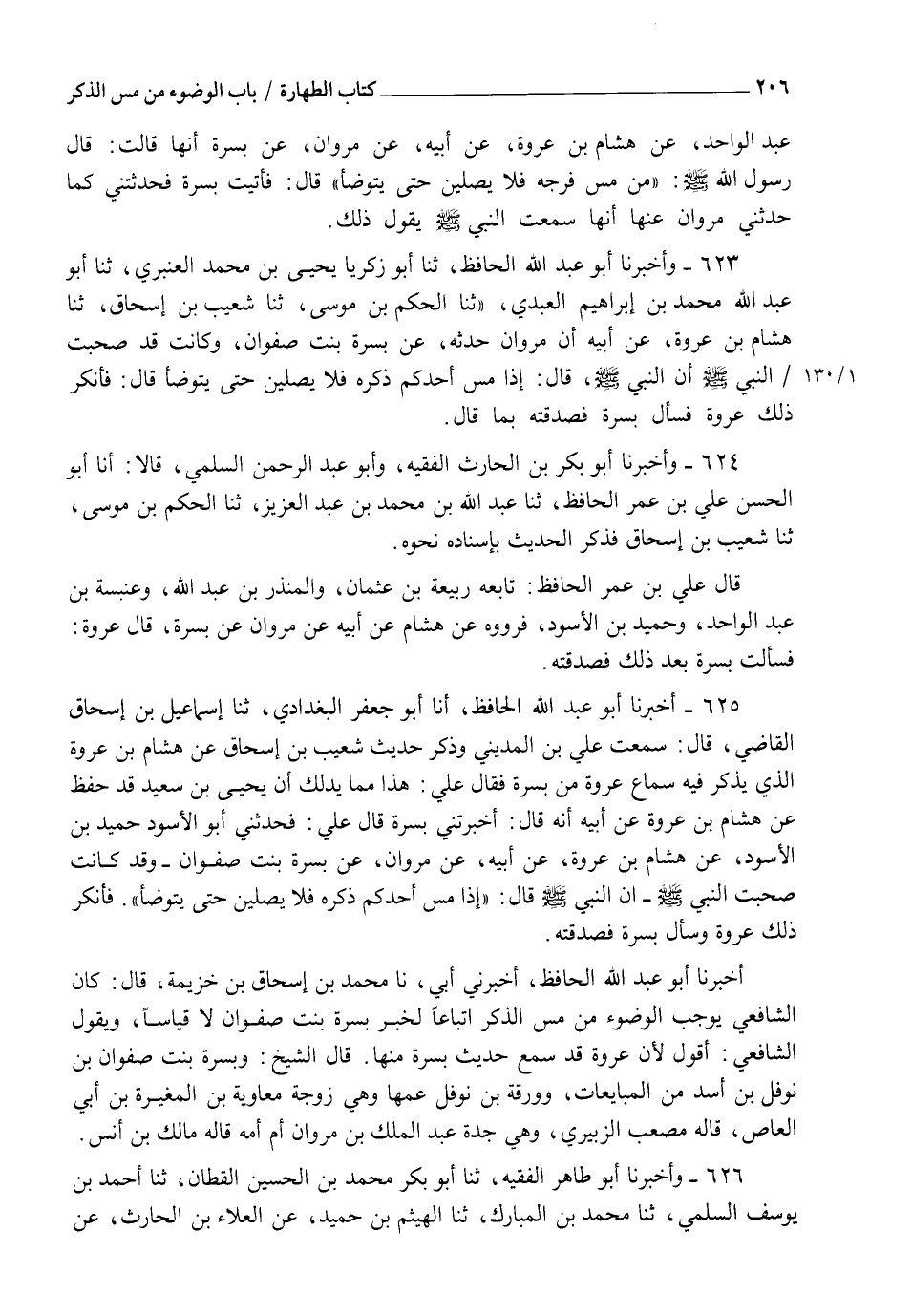 625 - أَخْبَرَنَا أَبُو عَبْدِ اللهِ الْحَافِظُ، أنا أَبُو جَعْفَرٍ الْبَغْدَادِيُّ، ثنا إِسْمَاعِيلُ بْنُ إِسْحَاقَ الْقَاضِي، قَالَ: سَمِعْتُ عَلِيَّ بْنَ الْمَدِينِيِّ، وَذَكَرَ حَدِيثَ شُعَيْبِ بْنِ إِسْحَاقَ، عَنْ هِشَامِ بْنِ عُرْوَةَ الَّذِي يَذْكُرُ فِيهِ سَمَاعَ عُرْوَةَ مِنْ بُسْرَةَ، فَقَالَ عَلِيٌّ: هَذَا مِمَّا يَدُلُّكَ أَنَّ يَحْيَى بْنَ سَعِيدٍ قَدْ حَفِظَ عَنْ هِشَامِ بْنِ عُرْوَةَ، عَنْ أَبِيهِ أَنَّهُ قَالَ: أَخْبَرَتْنِي بُسْرَةُ، قَالَ عَلِيٌّ: فَحَدَّثَنِي أَبُو الْأَسْوَدِ حُمَيْدُ بْنُ الْأَسْوَدِ، عَنْ هِشَامِ بْنِ عُرْوَةَ، عَنْ أَبِيهِ، عَنْ مَرْوَانَ، عَنْ بُسْرَةَ بِنْتِ صَفْوَانَ، وَقَدْ كَانَتْ صَحِبَتِ النَّبِيَّ صَلَّى اللهُ عَلَيْهِ وَسَلَّمَ، أَنَّ النَّبِيَّ صَلَّى اللهُ عَلَيْهِ وَسَلَّمَ قَالَ: §" إِذَا مَسَّ أَحَدُكُمْ ذَكَرَهُ فَلَا يُصَلِّيَنَّ حَتَّى يَتَوَضَّأَ " فَأَنْكَرَ ذَلِكَ عُرْوَةُ، وَسَأَلَ بُسْرَةَ فَصَدَّقَتْهُ. أَخْبَرَنَا أَبُو عَبْدِ اللهِ الْحَافِظُ، أَخْبَرَنِي أَبِي، نا مُحَمَّدُ بْنُ إِسْحَاقَ بْنِ خُزَيْمَةَ، قَالَ: كَانَ الشَّافِعِيُّ يُوجِبُ الْوُضُوءَ مِنْ مَسِّ الذَّكَرِ اتِّبَاعًا لِخَبَرِ بُسْرَةَ بِنْتِ صَفْوَانَ لَا قِيَاسًا، وَبِقَوْلِ الشَّافِعِيِّ أَقُولُ؛ لِأَنَّ عُرْوَةَ قَدْ سَمِعَ حَدِيثَ بُسْرَةَ مِنْهَا، قَالَ الشَّيْخُ: وَبُسْرَةُ بِنْتُ صَفْوَانَ بْنِ نَوْفَلِ بْنِ أَسَدٍ مِنَ الْمُبَايِعَاتِ، وَوَرَقَةُ بْنُ نَوْفَلٍ عَمُّهَا، وَهِيَ زَوْجَةُ مُعَاوِيَةَ بْنِ الْمُغِيرَةِ بْنِ أَبِي الْعَاصِ، قَالَهُ: مُصْعَبٌ الزُّبَيْرِيُّ، وَهِيَ جَدَّةُ عَبْدِ الْمَلِكِ بْنِ مَرْوَانَ أُمُّ أُمِّهِ، قَالَهُ: مَالِكُ بْنُ أَنَسٍ