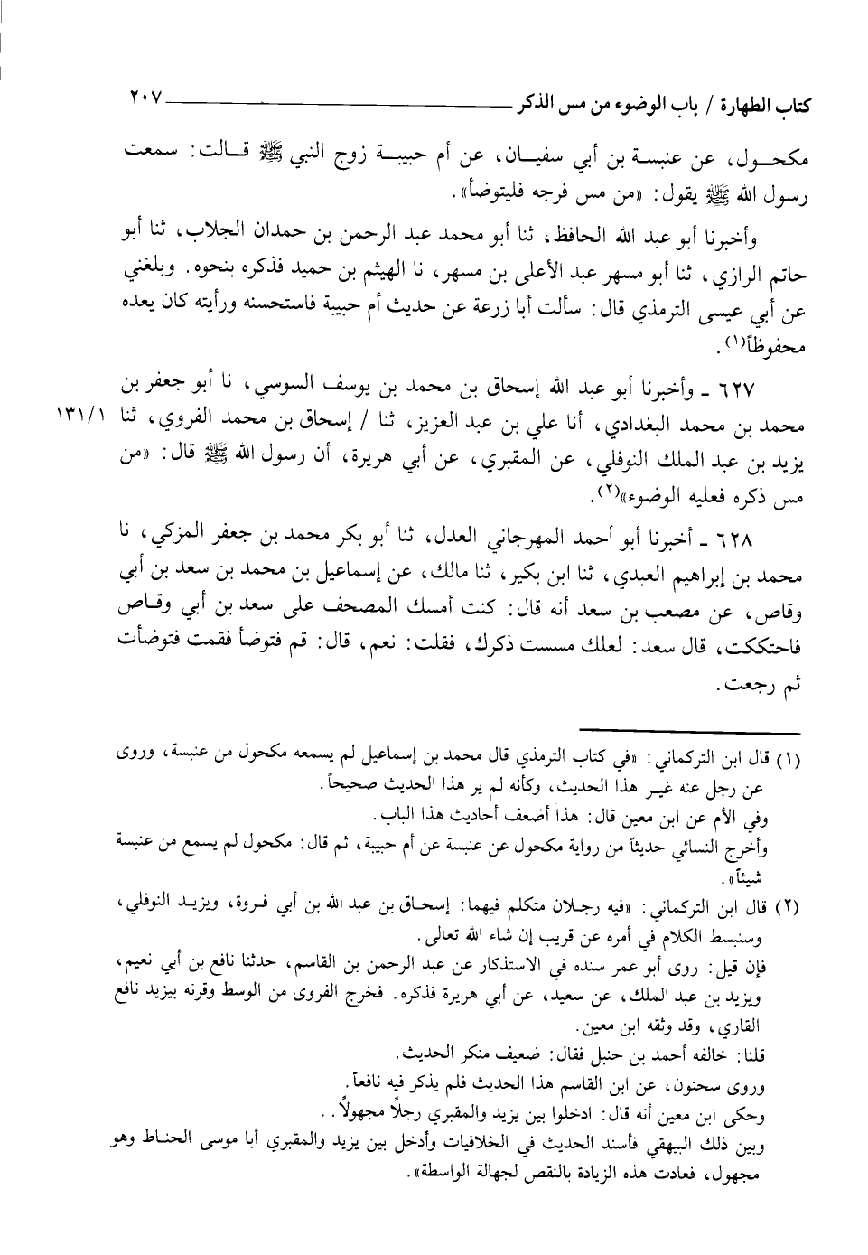 628 - أَخْبَرَنَا أَبُو أَحْمَدَ الْمِهْرَجَانِيُّ الْعَدْلُ، ثنا أَبُو بَكْرٍ مُحَمَّدُ بْنُ جَعْفَرٍ الْمُزَكِّي، نا مُحَمَّدُ بْنُ إِبْرَاهِيمَ الْعَبْدِيُّ، ثنا ابْنُ بُكَيْرٍ، ثنا مَالِكٌ، عَنْ إِسْمَاعِيلَ بْنِ مُحَمَّدِ بْنِ سَعْدِ بْنِ أَبِي وَقَّاصٍ، عَنْ مُصْعَبِ بْنِ سَعْدٍ، أَنَّهُ قَالَ: كُنْتُ أُمْسِكُ الْمُصْحَفَ عَلَى سَعْدِ بْنِ أَبِي وَقَّاصٍ، فَاحْتَكَكْتُ قَالَ سَعْدٌ: " §لَعَلَّكَ مَسَسْتَ ذَكَرَكَ " فَقُلْتُ نَعَمْ قَالَ: " قُمْ فَتَوَضَّأْ " فَقُمْتُ فَتَوَضَّأْتُ ثُمَّ رَجَعْتُ "، -[208]-