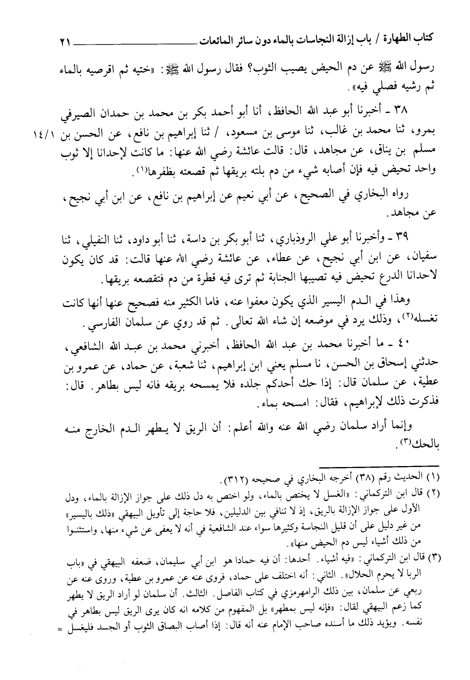 39 - وَأَخْبَرَنَا أَبُو عَلِيٍّ الرُّوذْبَارِيُّ، ثنا أَبُو بَكْرِ بْنُ دَاسَةَ، ثنا أَبُو دَاوُدَ، ثنا النُّفَيْلِيُّ، ثنا سُفْيَانُ، عَنِ ابْنِ أَبِي نَجِيحٍ، عَنْ عَطَاءٍ، عَنْ عَائِشَةَ رَضِيَ اللهُ عَنْهَا، قَالَتْ: " قَدْ كَانَ §يَكُونُ لِإِحْدَانَا الدِّرْعُ تَحِيضُ فِيهِ تُصِيبُهَا الْجَنَابَةُ، ثُمَّ تَرَى فِيهِ قَطْرَةً مِنْ دَمٍ فَتَقْصَعُهُ بِرِيقِهَا، وَهَذَا فِي الدَّمِ الْيَسِيرِ الَّذِي يَكُونُ مَعْفُوًّا عَنْهُ، فَأَمَّا الْكَثِيرُ مِنْهُ فَصَحِيحٌ عَنْهَا أَنَّهَا كَانَتْ تَغْسِلُهُ، وَذَلِكَ يَرِدُ فِي مَوْضِعِهِ إِنْ شَاءَ اللهُ تَعَالَى "، ثُمَّ قَدْ رُوِيَ عَنْ سَلْمَانَ الْفَارِسِيِّ