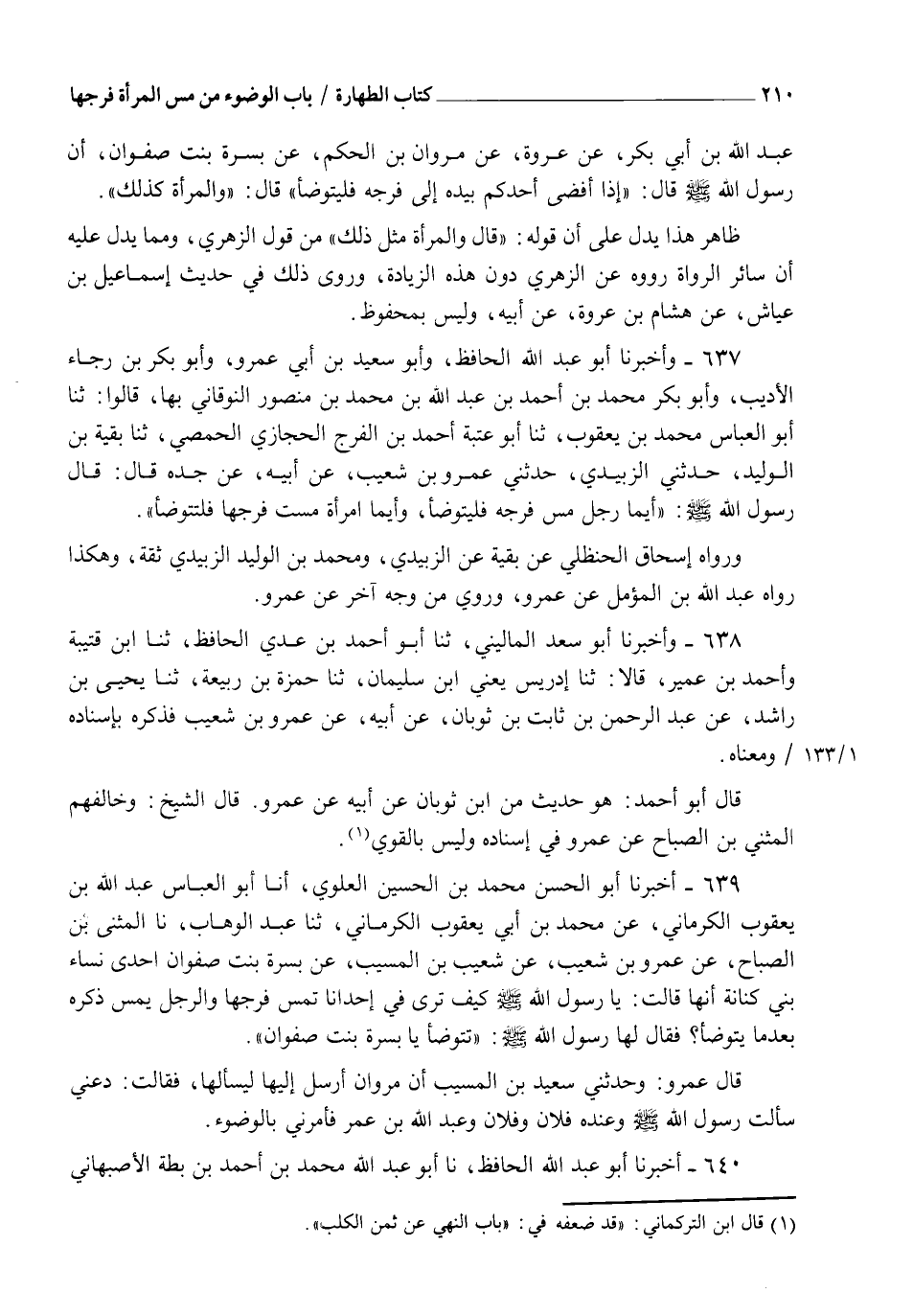 639 - أَخْبَرَنَا أَبُو الْحَسَنِ مُحَمَّدُ بْنُ الْحُسَيْنِ الْعَلَوِيُّ، أنا أَبُو الْعَبَّاسِ عَبْدُ اللهِ بْنُ يَعْقُوبَ الْكِرْمَانِيُّ، عَنْ مُحَمَّدِ بْنِ أَبِي يَعْقُوبَ الْكِرْمَانِيُّ، ثنا عَبْدُ الْوَهَّابِ، نا الْمُثَنَّى بْنُ الصَّبَّاحِ، عَنْ عَمْرِو بْنِ شُعَيْبٍ، عَنْ سَعِيدِ بْنِ الْمُسَيِّبِ، عَنْ بُسْرَةَ بِنْتِ صَفْوَانَ، إِحْدَى نِسَاءِ بَنِي كِنَانَةَ، أَنَّهَا قَالَتْ: يَا رَسُولَ اللهِ §كَيْفَ تَرَى فِي أَحَدِنَا تَمَسُّ فَرْجَهَا، وَالرَّجُلُ يَمَسُّ ذَكَرَهُ بَعْدَمَا يَتَوَضَّأُ، فَقَالَ لَهَا رَسُولُ اللهِ صَلَّى اللهُ عَلَيْهِ وَسَلَّمَ: " تَتَوَضَّأُ يَا بُسْرَةُ بِنْتُ صَفْوَانَ " قَالَ عَمْرٌو: وَحَدَّثَنِي سَعِيدُ بْنُ الْمُسَيِّبِ، أَنَّ مَرْوَانَ أَرْسَلَ إِلَيْهَا لِيَسْأَلَهَا فَقَالَتْ: دَعْنِي، سَأَلْتُ رَسُولَ اللهِ صَلَّى اللهُ عَلَيْهِ وَسَلَّمَ، وَعِنْدَهُ فُلَانٌ وَفُلَانٌ وَعَبْدُ اللهِ بْنُ عُمَرَ، فَأَمَرَنِي بِالْوُضُوءِ