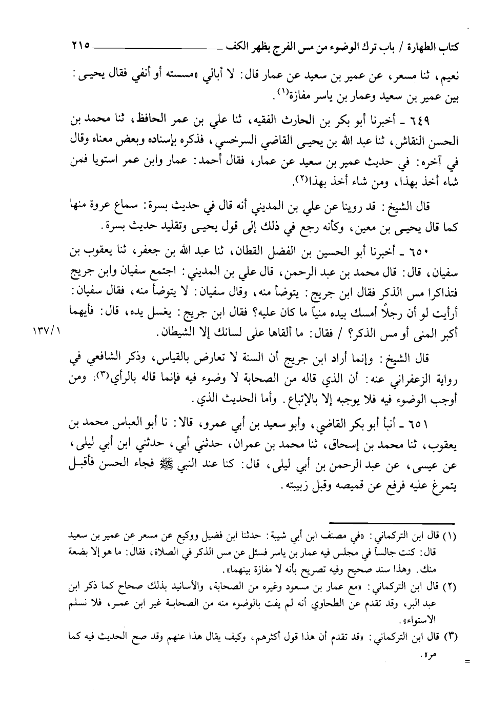 650 - أَخْبَرَنَا أَبُو الْحُسَيْنِ بْنُ الْفَضْلِ الْقَطَّانُ، ثنا عَبْدُ اللهِ بْنُ جَعْفَرٍ، ثنا يَعْقُوبُ بْنُ سُفْيَانَ، قَالَ: قَالَ مُحَمَّدُ بْنُ عَبْدِ الرَّحِيمِ: قَالَ عَلِيُّ بْنُ الْمَدِينِيِّ: اجْتَمَعَ سُفْيَانُ وَابْنُ جُرَيْجٍ فَتَذَاكَرَا مَسَّ الذَّكَرِ، فَقَالَ ابْنُ جُرَيْجٍ: " يُتَوَضَّأُ مِنْهُ "، وَقَالَ سُفْيَانُ: " لَا يُتَوَضَّأُ مِنْهُ "، فَقَالَ سُفْيَانُ: §" أَرَأَيْتَ لَوْ أَنَّ رَجُلًا أَمْسَكَ بِيَدِهِ مَنِيًّا مَا كَانَ عَلَيْهِ؟ " فَقَالَ ابْنُ جُرَيْجٍ " يَغْسِلُ يَدَهُ " قَالَ: " فَأَيُّهُمَا أَكْبَرُ الْمَنِيُّ أَوْ مَسُّ الذَّكَرِ؟ " فَقَالَ: " مَا أَلْقَاهَا عَلَى لِسَانِكَ إِلَّا الشَّيْطَانُ " قَالَ الشَّيْخُ: وَإِنَّمَا أَرَادَ ابْنُ جُرَيْجٍ أَنَّ السُّنَّةَ لَا تُعَارَضُ بِالْقِيَاسِ، وَذَكَرَ الشَّافِعِيُّ فِي رِوَايَةِ الزَّعْفَرَانِيِّ عَنْهُ أَنَّ الَّذِي قَالَهُ مِنَ الصَّحَابَةِ لَا وُضُوءَ فِيهِ فَإِنَّمَا قَالَهُ بِالرَّأْيِ وَمَنْ أَوْجَبَ الْوُضُوءَ فِيهِ فَلَا يُوجِبُهُ إِلَّا بِالِاتِّبَاعِ