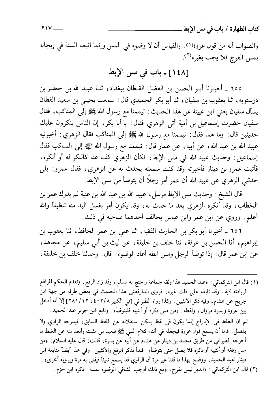 655 - أَخْبَرَنَا أَبُو الْحُسَيْنِ بْنُ الْفَضْلِ الْقَطَّانُ بِبَغْدَادَ، ثنا عَبْدُ اللهِ بْنُ جَعْفَرِ بْنِ دَرَسْتُوَيْهِ، ثنا يَعْقُوبُ بْنُ سُفْيَانَ، ثنا أَبُو بَكْرٍ الْحُمَيْدِيُّ، قَالَ: سَمِعْتُ يَحْيَى بْنَ سَعِيدٍ الْقَطَّانَ يَسْأَلُ سُفْيَان يَعْنِي ابْنَ عُيَيْنَةَ عَنْ هَذَا الْحَدِيثِ تَيَمَّمْنَا مَعَ رَسُولِ اللهِ صَلَّى اللهُ عَلَيْهِ وَسَلَّمَ إِلَى الْمَنَاكِبِ، فَقَالَ سُفْيَانُ حَضَرْتُ إِسْمَاعِيلَ بْنَ أُمَيَّةَ أَتَى الزُّهْرِيَّ، فَقَالَ: يَا أَبَا بَكْرٍ إِنَّ النَّاسَ يُنْكِرُونَ عَلَيْكَ حَدِيثَيْنِ قَالَ: وَمَا هُمَا؟ فَقَالَ: تَيَمَّمْنَا مَعَ رَسُولِ اللهِ صَلَّى اللهُ عَلَيْهِ وَسَلَّمَ إِلَى الْمَنَاكِبِ، فَقَالَ الزُّهْرِيُّ: أَخْبَرَنِيهِ عُبَيْدُ اللهِ بْنُ عَبْدِ اللهِ، عَنْ أَبِيهِ، عَنْ عَمَّارٍ، قَالَ: §تَيَمَّمْنَا مَعَ رَسُولِ اللهِ صَلَّى اللهُ عَلَيْهِ وَسَلَّمَ إِلَى الْمَنَاكِبِ. فَقَالَ إِسْمَاعِيلُ: وَحَدِيثُ عُبَيْدِ اللهِ فِي مَسِّ الْإِبْطِ، فَكَأَنَّ الزُّهْرِيَّ كَفَّ عَنْهُ كَالْمُنْكِرِ لَهُ أَوْ أَنْكَرَهُ فَأَتَيْتُ عَمْرَو بْنَ دِينَارٍ فَأَخْبَرْتُهُ وَقَدْ كُنْتُ سَمِعْتُهُ يُحَدِّثُ بِهِ عَنِ الزُّهْرِيِّ فَقَالَ: عَمْرٌو: بَلْ حَدَّثَنِي الزُّهْرِيُّ، عَنْ عُبَيْدِ اللهِ أَنَّ عُمَرَ أَمَرَ رَجُلًا أَنْ يَتَوَضَّأَ مِنْ مَسِّ الْإِبْطِ. قَالَ الشَّيْخُ: وَحَدِيثُ مَسِّ الْإِبْطِ مُرْسَلٌ عُبَيْدُ اللهِ بْنُ عَبْدِ اللهِ بْنِ عُتْبَةَ لَمْ يُدْرِكْ عُمَرَ بْنَ الْخَطَّابِ وَقَدْ أَنْكَرَهُ الزُّهْرِيُّ بَعْدَمَا حَدَّثَ بِهِ وَقَدْ يَكُونُ أَمَرَ بِغَسْلِ الْيَدِ مِنْهُ تَنْظِيفًا، وَاللهُ أَعْلَمُ " وَرُوِيَ عَنِ ابْنِ عُمَرَ، وَابْنِ عَبَّاسٍ يُخَالِفُ أَحَدُهُمَا صَاحِبَهُ فِي ذَلِكَ