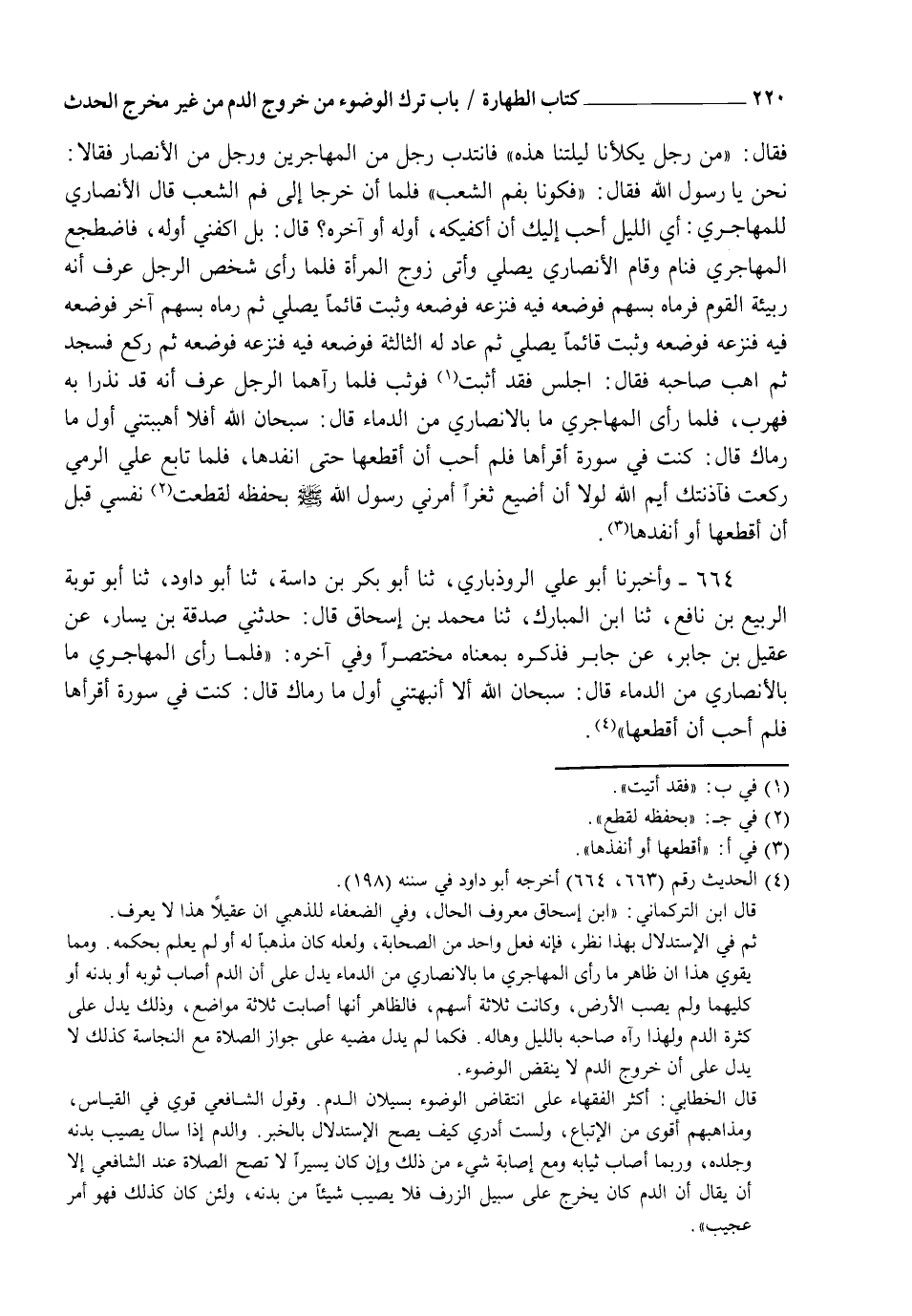 664 - وَأَخْبَرَنَا أَبُو عَلِيٍّ الرُّوذْبَارِيُّ، ثنا أَبُو بَكْرِ بْنُ دَاسَةَ، ثنا أَبُو دَاوُدَ، ثنا أَبُو تَوْبَةَ الرَّبِيعُ بْنُ نَافِعٍ، ثنا ابْنُ الْمُبَارَكِ، ثنا مُحَمَّدُ بْنُ إِسْحَاقَ، قَالَ: حَدَّثَنِي صَدَقَةُ بْنُ يَسَارٍ، عَنْ عَقِيلِ بْنِ جَابِرٍ، عَنْ جَابِرٍ، فَذَكَرَهُ بِمَعْنَاهُ مُخْتَصَرًا وَفِي آخِرِهِ فَلَمَّا رَأَى الْمُهَاجِرِيُّ مَا بِالْأَنْصَارِيِّ مِنَ الدِّمَاءِ قَالَ: " سُبْحَانَ اللهِ §أَلَا أَنْبَهْتَنِي أَوَّلَ مَا رَمَاكَ "، قَالَ: كُنْتُ فِي سُورَةٍ أَقْرَأُهَا فَلَمْ أُحِبَّ أَنْ أَقْطَعَهَا "